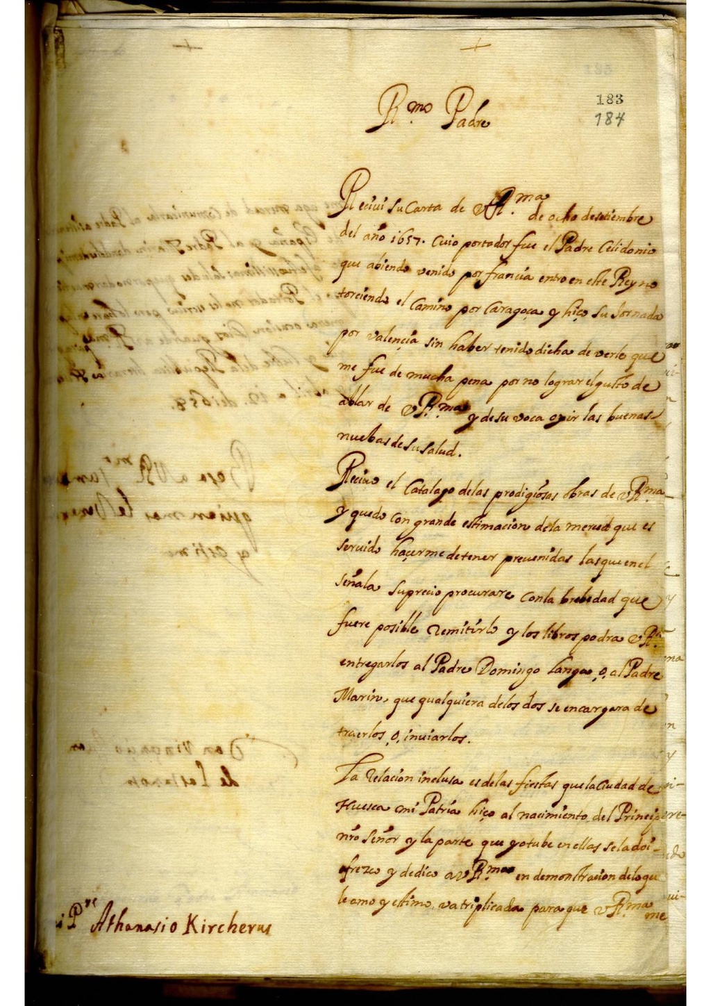 Recibo el Catálogo de las prodigiosas obras de Vuestra Reverendísima y quedo con grande estimación de la merced que es servido hacerme de tener prevenidas las que en el señala su precio. procuraré con la brevedad que fuere posible remitirlo y los libros podra Vuestra Reverencia entregarlos al Padre Domingo Langa, o al Padre Marin, que qualquiera de los dos se encargará de traerlos, o inviarlos.