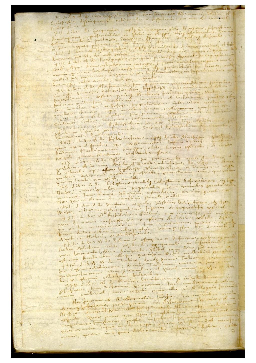 XII. Liber [est] de Geographia agitq[ue] de Terraquei globi divisione, descriptione, dimensione, repraesentatione in Globis ac Mappis, alijsq[ue] affectionibus. Terraru[m] orbem divido in partes sex, Europam, Asiam etc. singulasq[ue] describo, ac in sua regna, provincias etc. divido etc.