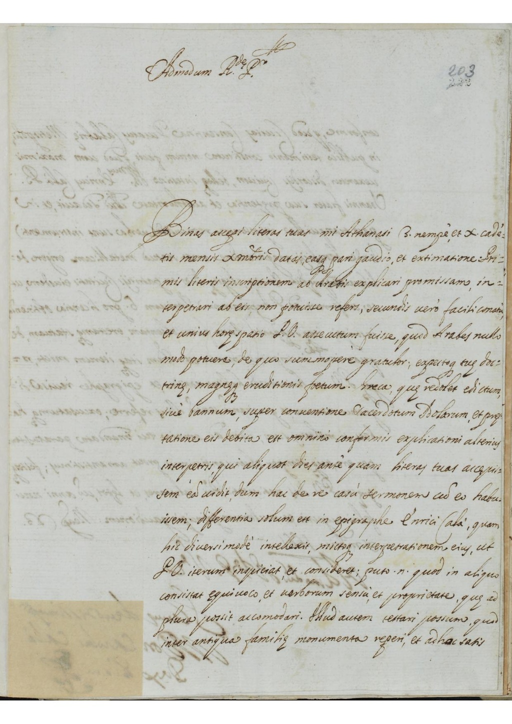 Binas accepi literas tuas mi Athanasi B. nempe et X cadetis mensis decembris datas easque pari gaudio, et extimatione; Primis literis inscriptionem ab Arabis explicari promissam, interpetrari ab eis, non potuisse refers, secundis vero facili conari et unius horae spatio P.V. assecutum fuisse, quod Arabes nullo modo potuere, de quo summopere gratulor; expertoque tuae doctrinae, magnaeque eruditionis petum. Greca, quae recolet edictum, sive bannum, super conventione Sacerdotum Idolarum, et prestatione eis debita est omnino conformis explicationi alterius interpetris qui aliquot dies ante quam literas tuas accepissem eam vidit dum hac de re casa sermonem cum eo habuissem; differentia solum est in epigraphe Enrici Calà, quam hic diversi mode intellescit, mictoque interpretationem eius, ut P.V. iterum inspiciat et consideret; puto n quod in aliquo consistat Equivoco et verborum sensu et proprietate quae ad plura poscit accomodari. Illud autem retraxi possum, quod inter antiqua familiae monumenta reperi, et adhoc satis