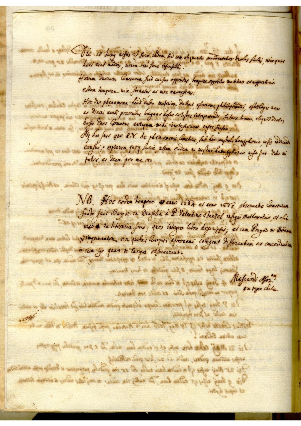 N.B. Hoc eodem tempore, anno 1664 et anno 1665, observatio Cometarum facta fuit Bahiæ in Brasilia â P. Valentino Stanzel, insigni Mathematico, et olim meo in re literaria socio; quos integro libro descripsit; et iam Pragæ in Boëmia imprimuntur. Ex quibus Europæi astronomi, colligent differentiam et concordantium cum ijs quas in Europa observarunt.