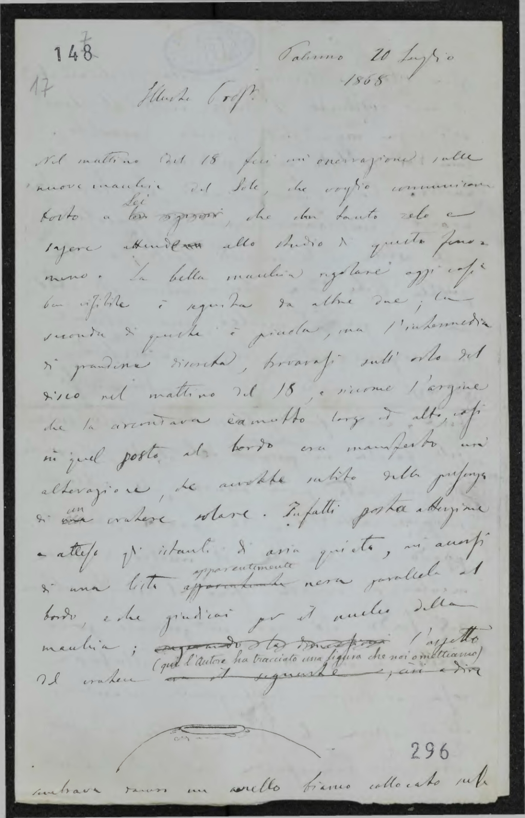 Nel mattino del 18 feci un'osservazione sulle nuove macchie del sole, che voglio comunicare tosto a lor signori, che con tanto zelo e sapere attendono allo studio di questo fenomeno. La bella macchia regolare oggi così ben visibile è seguita da altre due; la seconda di queste è piccola, ma l'intermedia di grandezza discreta, trovavasi sull'orlo del disco nel mattino del 18, e siccome l'argine che la circondava era molto largo ed alto, così in quel posto al bordo era manifesta una alterazione, che avrebbe subito dalla presenza di un cratere solare. Infatti posta attenzione si attese gli istanti di aria quieta, mi accorsi di una lista apparentemente nera parallela al bordo, e che giudicai per il nucleo della macchia; l'aspetto del cratere era il seguente e cioè a dire [1]
