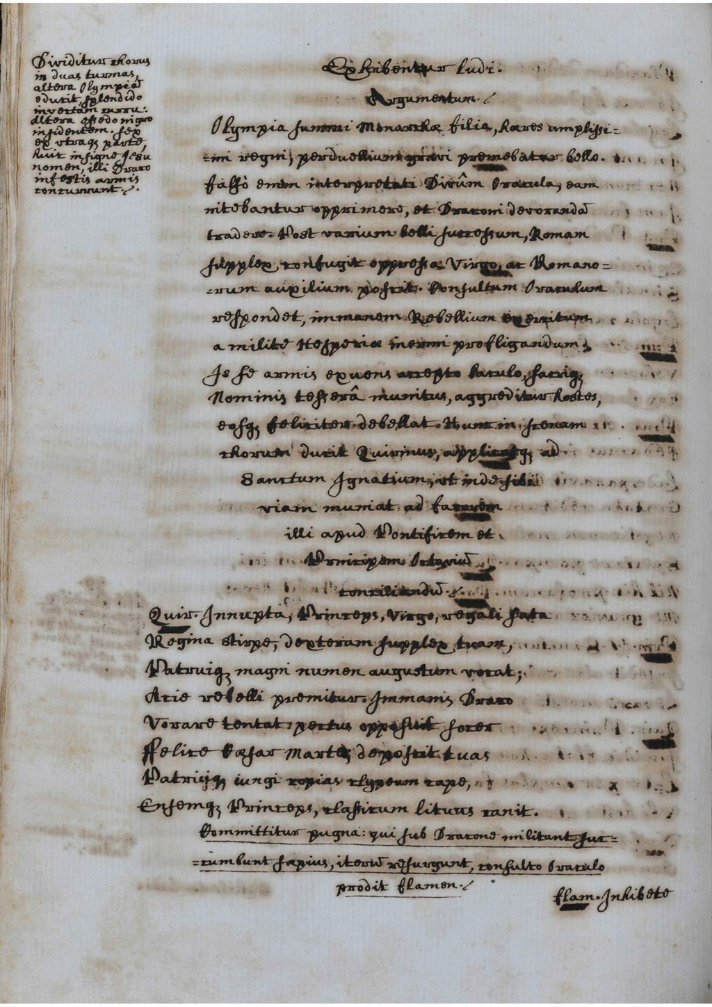 - ↑ 1.Dividitur chorus in duas turmas. Altera Urania reducit splendido invectam curru, alteram draconem nigra carruca insidentem. Sex ex utraque parte infestis armis concurrunt.