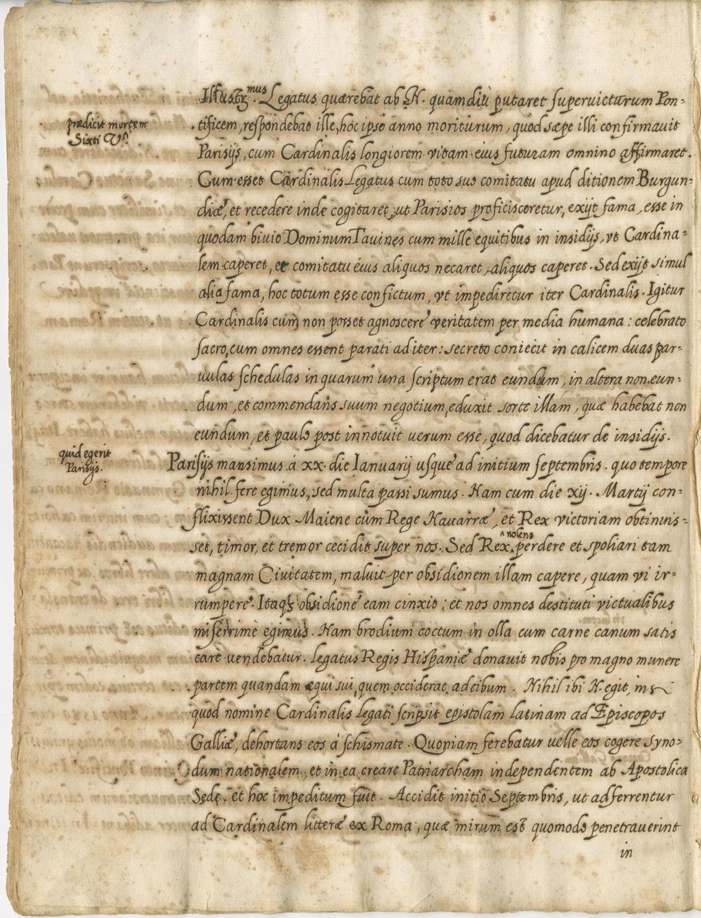 Parisiis mansimus a xx. die Ianuarii usque ad initium Septembris. Quo tempore nihil fere egimus, sed multa passi sumus. Nam cum die xii. Martii conflixissent Dux Maiene cum Rege Navarrae, et Rex victoriam obtinuisset, timor et tremor cecidit super nos. Sed Rex nolens perdere et spoliari magnam Civitatem, maluit per obsidionem illam capere, quam vi irrumpere. Itaque obsidione eam cinxit; et nos omnes destituti victualibus miserrime egimus. Nam brodium coctum in olla cum carne canum satis care vendebatur. Legatus Regis Hispaniae donavit nobis pro magno munere partem quandam equi sui, quem occiderat ad cibum. Nihil ibi N. egit, in si quod nomine Cardinalis Legati scripsit epistolam latinam ad Episcopos Galliae, dehortans eos a Schismate. Quoniam ferebatur velle eos cogere Synodum nationalem, et in ea creare Patriarcham independentem ab Apostolica Sede. Et hoc impeditum fuit. Accidit initio Septembris, ut adferrentur ad Cardinalem litterae ex Roma, quae mirum est quomodo penetraverint