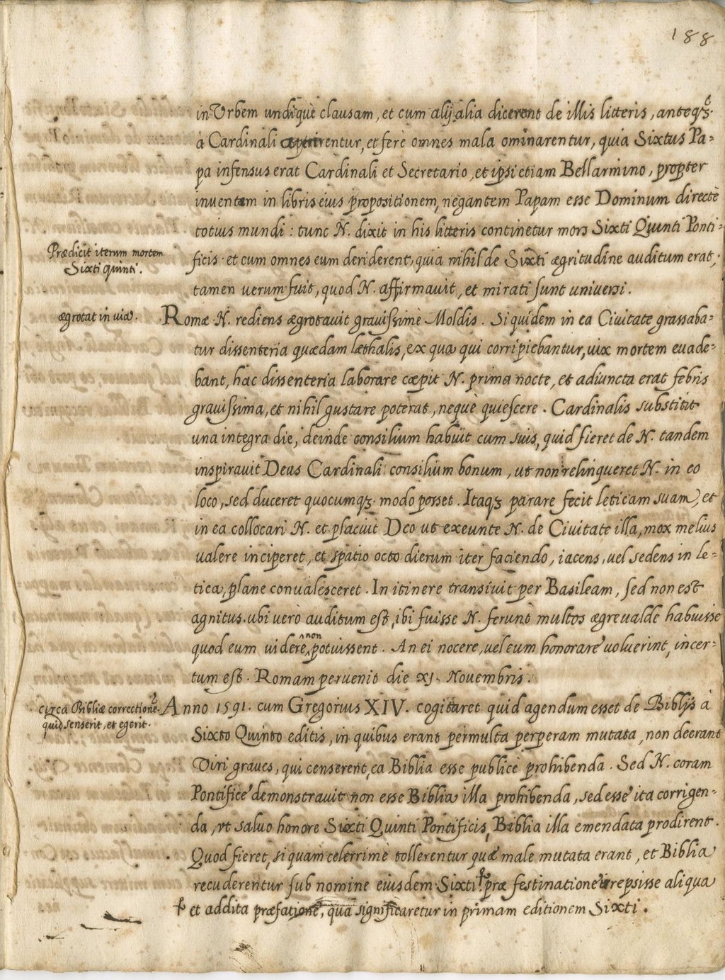 in Urbem undique clausam, et cum alii alia dicerent de illis litteris, antequam a Cardinali aperirentur, et fere omnes mala ominarentur, quia Sixtus Papa infensus erat Cardinali et Secretario, et ipsi etiam Bellarmino, propter inventem in libris eius propositionem, negantem Papam esse Dominum directe totius mundi: tunc N. dixit in his litteris continetur mors Sixti Quinti Pontificis et cum omnes erum deriderent, quia nihil de Sixti aegritudine auditum erat; tamen utrum fuit, quod N. affirmavit, et mirati sunt universi.