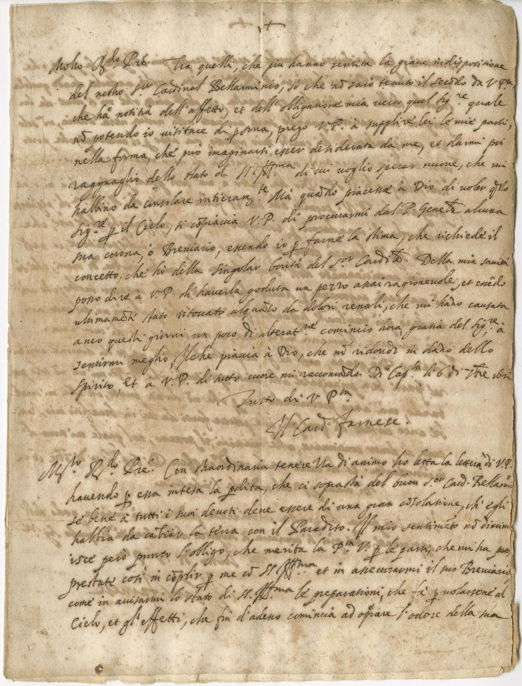 Tra quelli, che più hanno sentita la grave indisposizione del nostro S.r Cardinal Bellarmino, so che non sarò tenuto il secondo da V. P.ta che ha notitia dell'affetto, et dell'obligatione mia verso quel Sig.re quale non potendo io visitare di persona, prego V.P. a supplire lei le mie parti, nella forma, che può imaginarsi esser desiderata da me, et darmi poi ragguaglio dello stato di SS. Ill.ma di cui voglio sperar nuove, che mi habbino da consolare intieram.te. Ma quando piacesse a Dio di voler questo Sig.re per il Cielo, si compiaccia V. P. di procurarmi dal P. Generale alcuna sua corona, o Breviario, essendo io per farne la stima, che richiede il concetto, che ho della singolar bontà del S.or Cardi.le. Della mia sanità posso dire a V.P. di haverla goduta un pezzo assai ragionevole, et essendo ultimamente stato ritoccato alquanto da dolori renali, che mi hanno causata anco questi giorni un poco di alterat.ne comincio hora, grazia del Sig.re, a sentirmi meglio, il che piaccia a Dio, che non ridondi in danno dello spirito, et a V.P. di tutto cuore mi raccomando. Di Cap.la li 6 di 7.bre 1621.