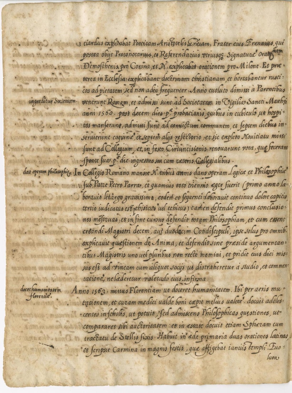 ciardus explicabat Poeticam Aristotelis Graecam, Frater eius Frennius, qui postea obiit Protonotarius, et Referendarius utriusque Signaturae Orat.nem Demosthenis pro Corona, et N. explicabat orationem pro Milone. Et praeterea in Ecclesia explicabant doctrinam christianam, et hortabantur rusticos ad pietatem, sed non adeo frequenter. Anno evoluto dimissi a Parentibus venerunt Romam, et admissi sunt ad Societatem in Vigilia Sancti Matthaei anni 1560 post decem dies p.ae probationis, quibus in cubiculo, ut hospites manserunt, admissi sunt ad convictum communem, et septem diebus inservierunt coquinae, et septem aliis refectorio, et sic expleto Novitiatu missi sunt ad Collegium, et in festo Circumcisionis renovarunt vota, quae fecerant sponte sua p.o die ingressus sui cum caeteris Collegialibus.