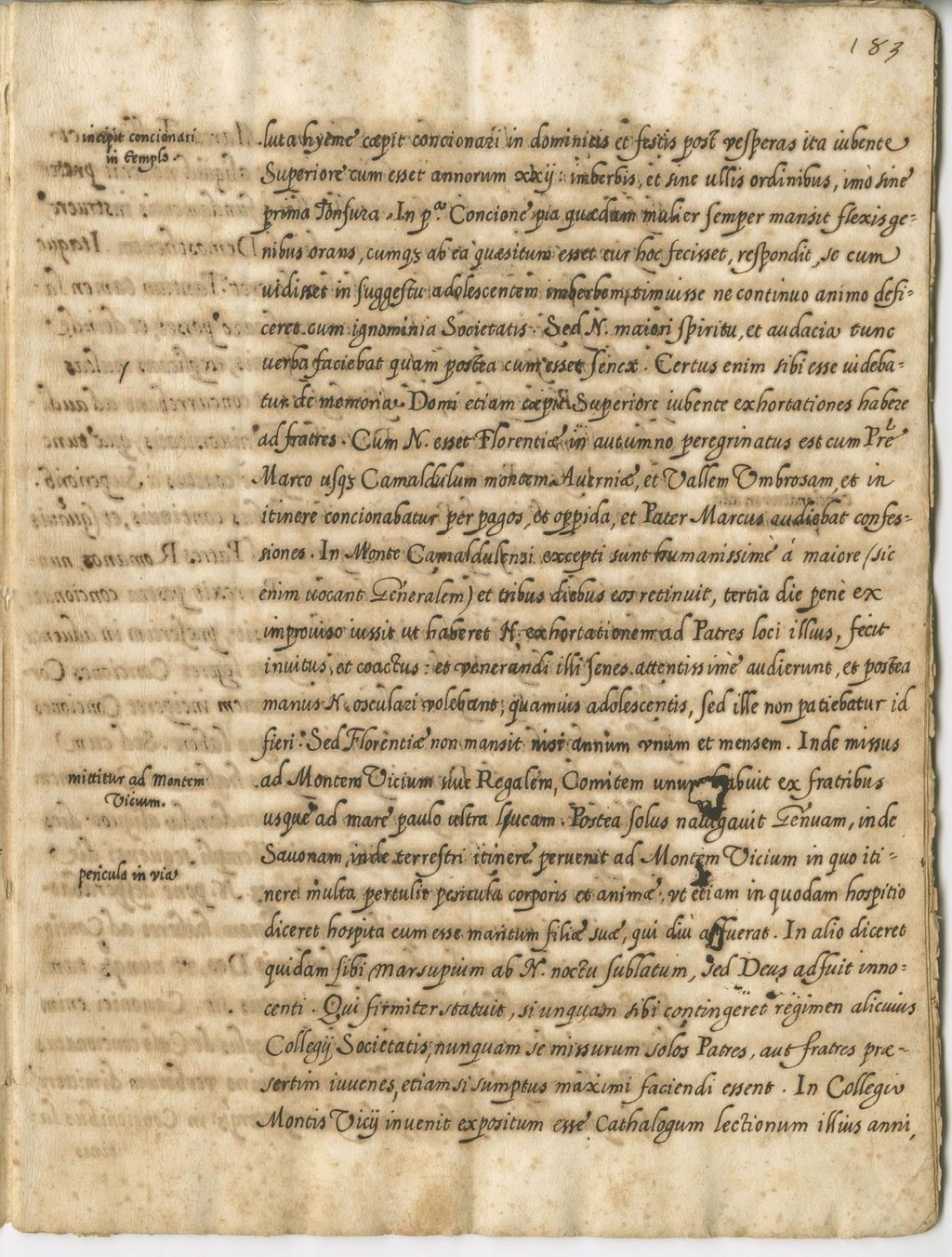 luta hyeme coepit concionari in dominicis et festis post vesperas ita iubente Superiore cum esset annorum XXII: imberbis, et sine ullis ordinibus, imo sine prima Tonsura. In p.a Concione pia quaedam mulier semper mansit flexis genibus orans, cumque ab ea quaesitum esset cur hoc fecisset, respondi, se cum vidisset in suggestu adolescentem imberbem, timuisse ne continuo animo deficeret cum ignominia Societatis. Sed N. maiori Spiritu, et audacia tunc verba faciebat quam postea cum esset Senex. Certus enim sibi esse videbatur de memoria. Domi etiam coepit Superiore iubente exhortationes habere ad fratres. Cum N. esset Florentiae in autumno peregrinatus est cum P.re Marco usque Camaldulum montem Averniae, et Vallem Umbrosam, et in itinere concionabatur per pagos, et oppida, et Pater Marcus audiebat confessiones. In Monte Camaldolensi excepti sunt humanissime a maiore (sic enim vocant Generalem) et tribus diebus eos retinuit, tertia die pene ex improviso iussit ut haberet N. exhortationem ad Patres loci illius, fecit invitus et coactus: et venerandi illi senes attentissime audierunt, et postea manus N. osculari volebant, quamvis adolescentis, sed ille non patiebatur id fieri. Sed Florentiae non mansit nisi annum unum et mensem. Inde missus ad Montem Vicium sive Regalem, Comitem unum habuit ex fratribus usque ad mare paulo ultra Lucam. Postea solus navigavit Genuam, inde Savonam, inde terrestri itinere pervenit ad Montem Vicium in quo itinere multa pertulit pericula corporis et animae; ut etiam in quodam hospitio diceret hospita cum esse maritum filiae suae, qui diu affuerat. In alio diceret quidam sibi marsupium ab N. noctu sublatum, sed Deus adfuit innocenti. Qui firmiter statuit, si unquam sibi contingeret regimen alicuius Collegii Societatis, nunquam se missurum solos Patres, aut fratres praesertim iuvenes, etiam si sumptus maximi faciendi essent. In Collegio Montis Vicii invenit expositum esse Cathalogum lectionum illius anni,