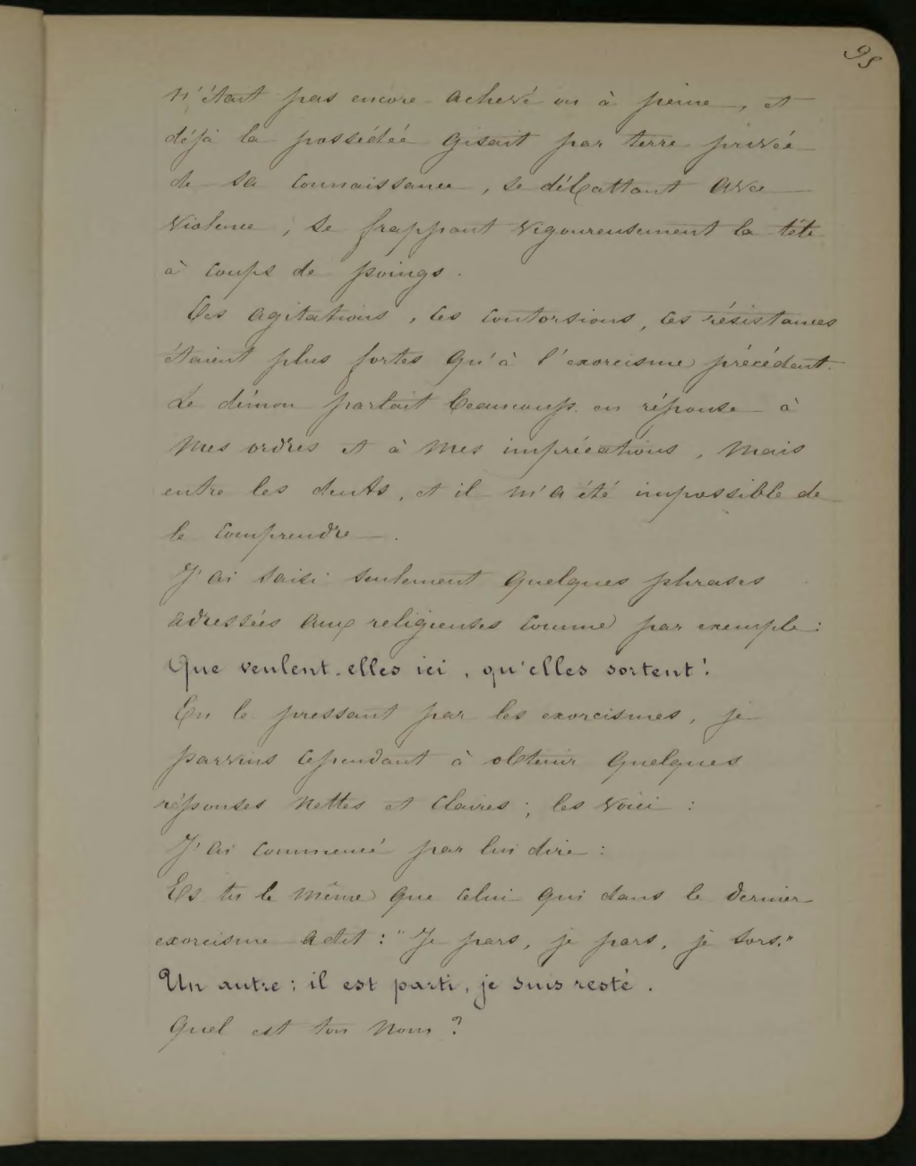 Ces agitations, ces contorsions, ces résistances étaient plus fortes qu’à l’exorcisme précèdent. Le démon parlait beaucoup en réponse à mes ordres et à mes imprécations, mais entre les dents, et il m’a été impossible de comprendre.