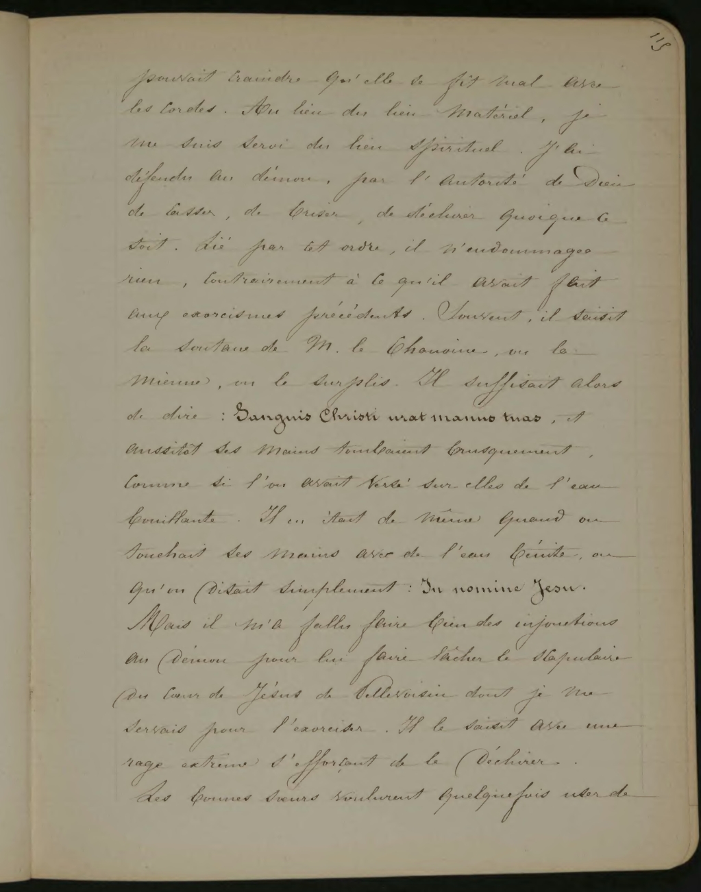 pouvait craindre qu’elle se fit mal avec les cordes. Au lieu du lieu matériel, je me suis servi du lieu spirituel. J’ai défendu au démon, par l’Autorité de Dieu de cesser, de briser, de déchirer quoique ce soit. Lié par cet ordre, il n’endommagea rien, contrairement à ce qu’il avait fait aux exorcismes précédents. Souvent, il saisit la soutane de M. le Chanoine, ou la mienne, ou le surplis. Il suffisait alors de dire: Sanguis Christi urat manus tuas, et aussitôt ses mains tombaient brusquement, comme si l’on avait versé sur elles de l’eau bouillante. Il en était de même quand on touchait ses mains avec de l’eau bénite, ou qu’on disait simplement: In nomine Jesu. Mais il m’a fallu faire bien des injonctions au démon pour lui faire lâcher le scapulaire ou cœur de Jésus de Pellevoisin dont je me servais pour l’exorciser. Il le saisit avec une rage extrême s’efforçant de le déchirer. Les bonnes sœurs voulurent quelquefois user de