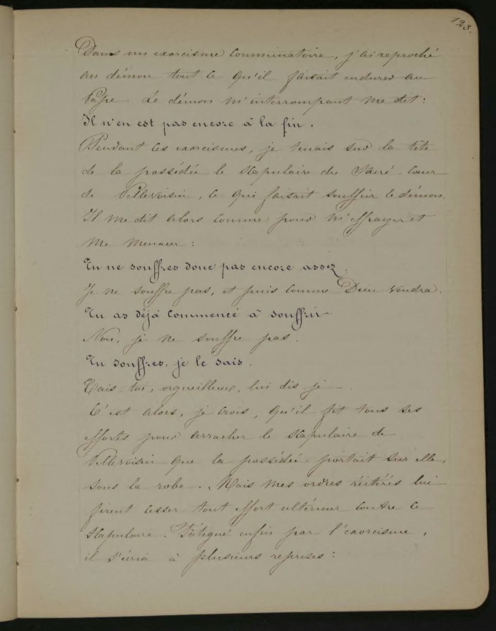 C’est alors, je crois, qu’il fit tous ses efforts pour arracher le scapulaire de Pellevoisin que la possédée portait sur elle, sur la robe. Mais mes ordres réitérés lui firent cesser tout effort ultérieur contre ce scapulaire. Fatigué enfin par l’exorcisme, il s’écria à plusieurs reprises: