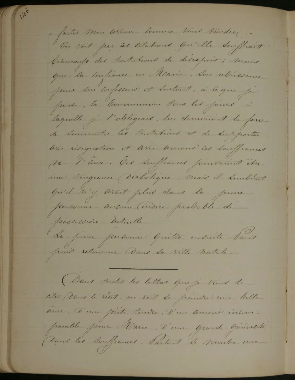 faites mon avenir comme vous voudrez». On voit par ces citations qu’elle souffrait beaucoup des tentations de désespoir; mais que sa confiance en Marie, son obéissance pour son confesseur et surtout, à ce que je pense, la Communion tous les jours à laquelle je l’obligeais, lui donnaient la force de surmonter ces tentations et de supporter avec résignation et avec amour ces souffrances de l’âme. Ces souffrances pouvaient être une vengeance diabolique, mais il semblait qu’il avait plus dans la jeune personne aucune indice probable de possession actuelle.