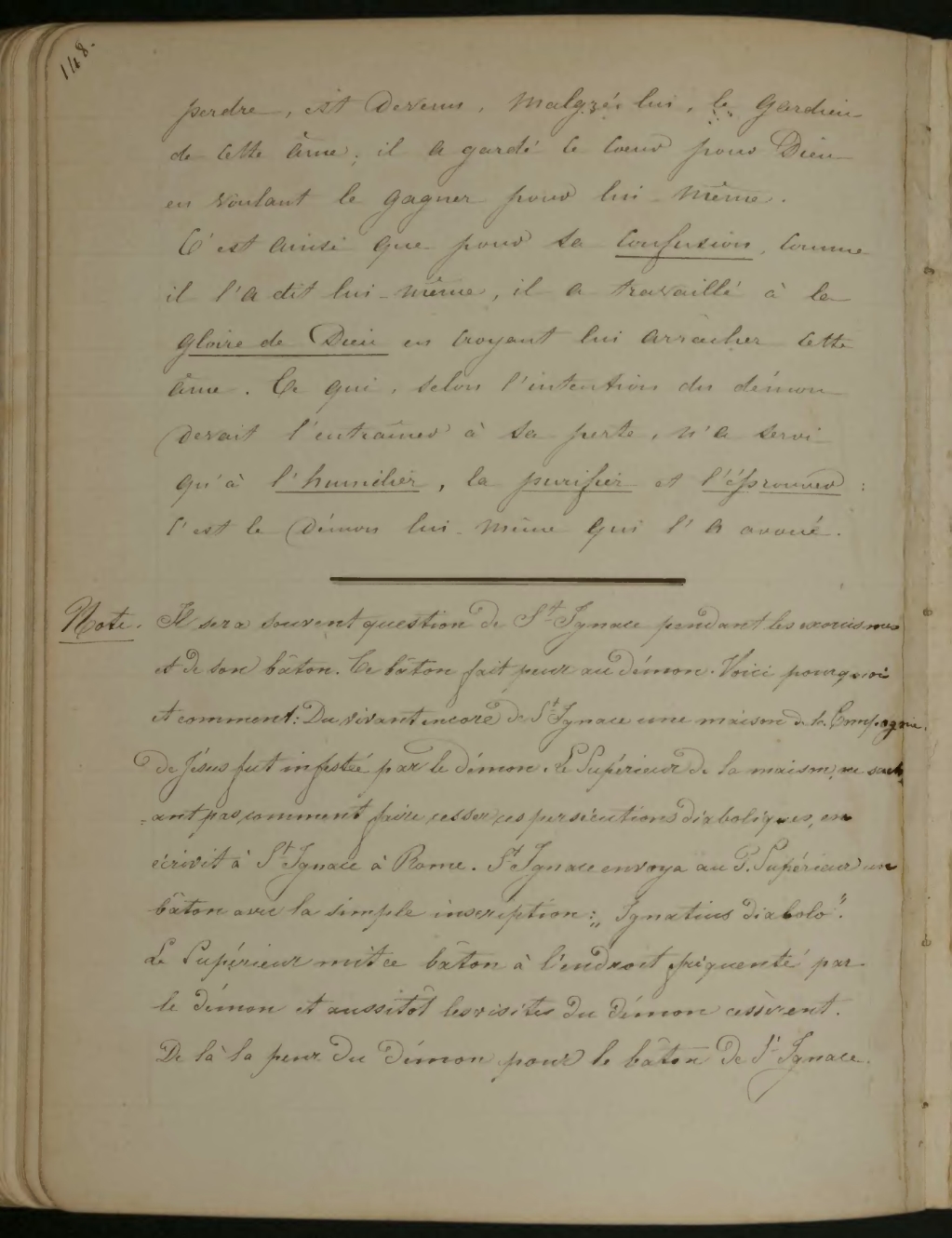 Note. Il sera souvent question de St Ignace pendant les exorcismes et de son bâton. Ce bâton fait peur au démon. Voici pourquoi et comment: Du vivant encore de St Ignace une maison de la Compagnie de Jésus fut infesté par le démon. Le Supérieur de la maison ne sachant pas comment faire cesser ces persécutions diaboliques, en écrivit à St Ignace à Rome. St Ignace envoya au P. Supérieur un bâton avec la simple inscription: “Ignatius diabolo”. Le Supérieur mit ce bâton[1] à l’endroit fréquenté par le démon et aussitôt les visites du démon cessèrent. De là sa peur du démon pour le bâton de St Ignace.[2]