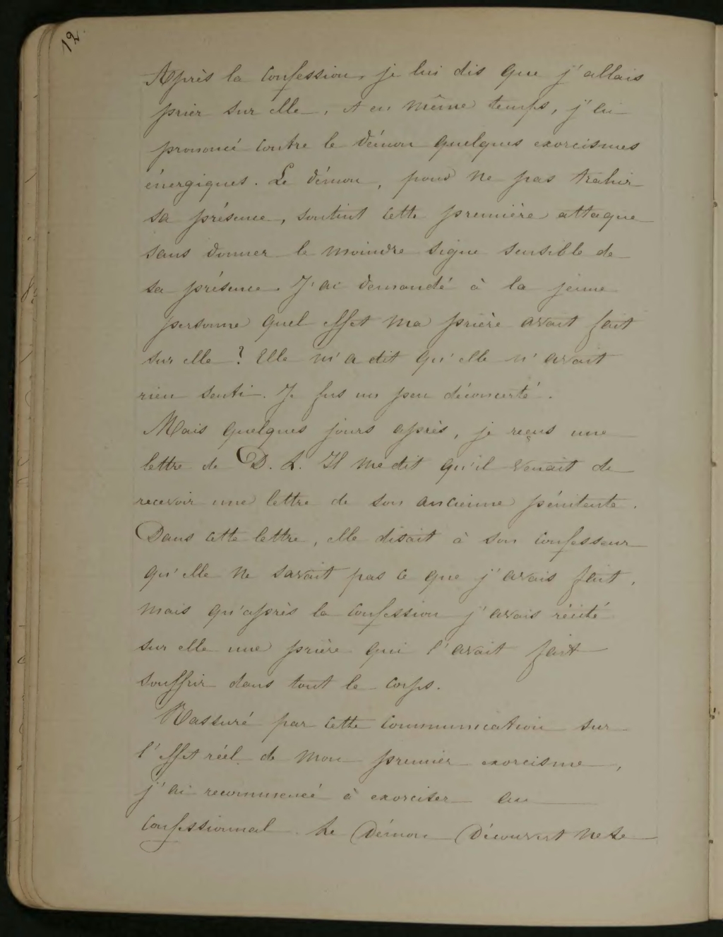 Rassuré par cette communication sur l’effet réel de mon premier exorcisme, j’ai recommencé à exorciser au confessionnal. Le démon découvert ne se