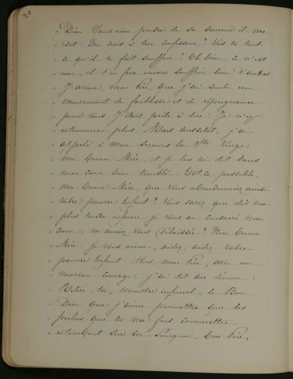 Dieu. Sans rien perdre de sa douceur il me dit: Tu crois à ton confesseur? Vois-tu tout ce qu’il te fait souffrir? Eh bien, ce n’est rien, il t’en fera encore souffrir bien d’autres. J’avoue, mon Père, que j’ai senti un mouvement de faiblesse et de répugnance pour vous. J’étais prête à dire: Je n’y retournerai plus. Mais aussitôt, j’ai appelé à mon secours la Ste Vierge, ma bonne Mère et je lui ai dit dans mon cœur bien troublé: Est-ce possible, ma bonne Mère, que vous abandonniez ainsi votre pauvre enfant? Vous savez que dès ma plus tendre enfance je vous ai consacré mon cœur; m’auriez-vous délaissée? Non, bonne Mère, je vous aime, aidez, aidez votre pauvre enfant. Alors, mon Père, avec un nouveau courage, j’ai dit au démon: Retire-toi, monstre infernal, le Bon Dieu que j’aime permettra que les péchés que tu me fais commettre retombent sur toi. Pourquoi, bon Père,