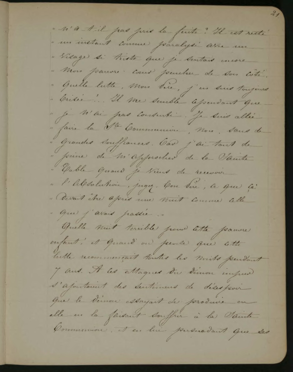 n’a-t’il pas pris la fuite? Il est resté un instant comme paralysé avec un visage si triste que je sentais encore mon pauvre cœur pencher de son coté, quelle lutte, mon Père, j’en suis toujours brisée!... Il me semble cependant que je n’ai pas consenti. Je suis allée faire la Sainte Communion, non sans de grandes souffrances. Car j’ai tant de peine de m’approcher de la Sainte Table quand je viens de recevoir l’absolution, jugez, bon Père, ce que ça devait être après une nuit comme celle que j’avais passée».