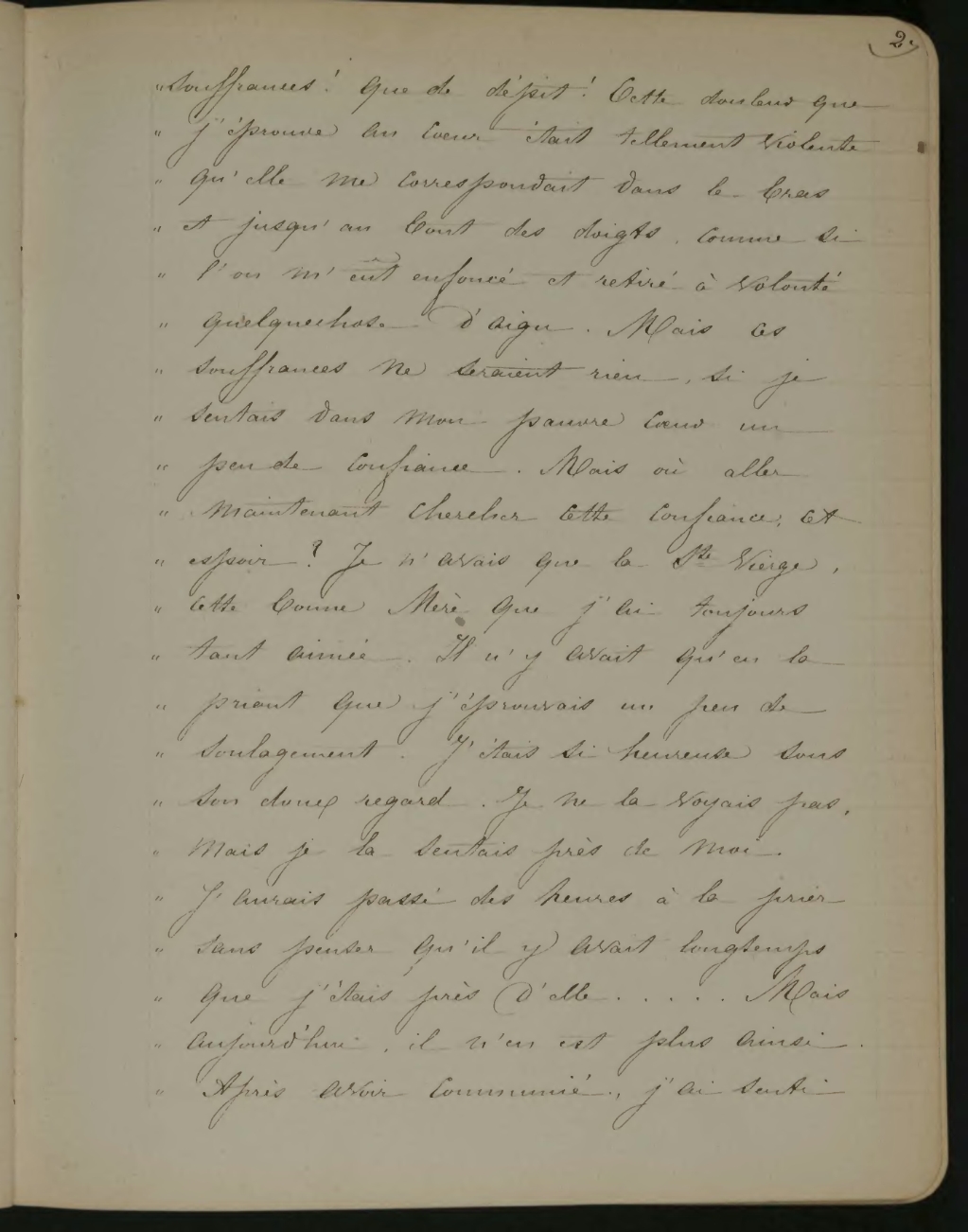 souffrances! Que de dépit! Cette douleur que j’éprouve au cœur était tellement violente qu’elle me correspondait dans le bras et jusqu’au bout des doigts, comme si l’on m’eût enfoncé et retiré à volonté quelque chose d’aigu. Mais ces souffrances ne seraient rien si je sentais dans mon pauvre cœur un peu de confiance. Mais où aller maintenant chercher cette confiance, cet espoir? Je n’avais que la Ste Vierge, cette bonne Mère que j’ai toujours tout aimée. Il n’y avait qu’en la priant que j’éprouvais un peu de soulagement. J’étais si heureuse sous son doux regard. Je ne la voyais pas, mais je la sentais près de moi j’aurais passé des heures à la prier sans penser qu’il y avait longtemps que j’étais près d’elle... Mais aujourd’hui il n’en est plus ainsi. Après avoir communié, j’ai senti