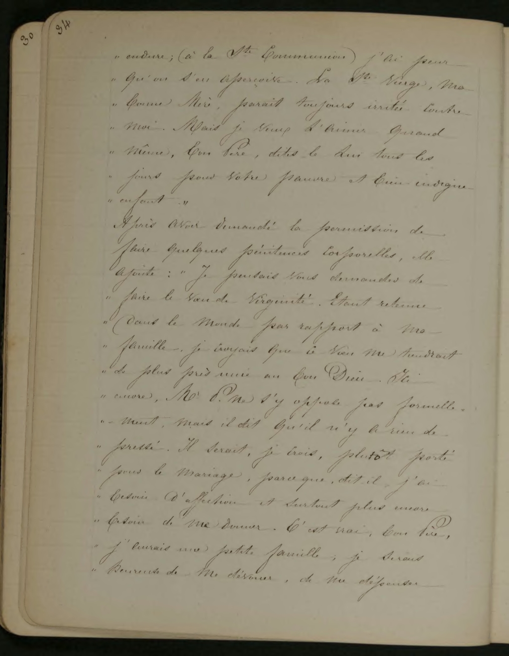 Après avoir demandé la permission de faire quelques pénitences corporelles, elle ajoute: «Je pensais vous demander de faire le vœu de virginité. Etant retenue dans le monde par rapport à ma famille, je croyais que ce vœu me tiendrait de plus près unie au bin Dieu. Ici encore, Mr. P. ne s’y oppose pas formellement, mais il dit qu’il n’y a rien de pressé. Il serait, je crois, plutôt porté pour le mariage, parce que, dit-il, j’ai besoin d’affection et surtout plus encore besoin de me donner. C’est vrai, bon Père, j’aurais une petite famille; je serais heureuse de me dévouer, de me dépenser
