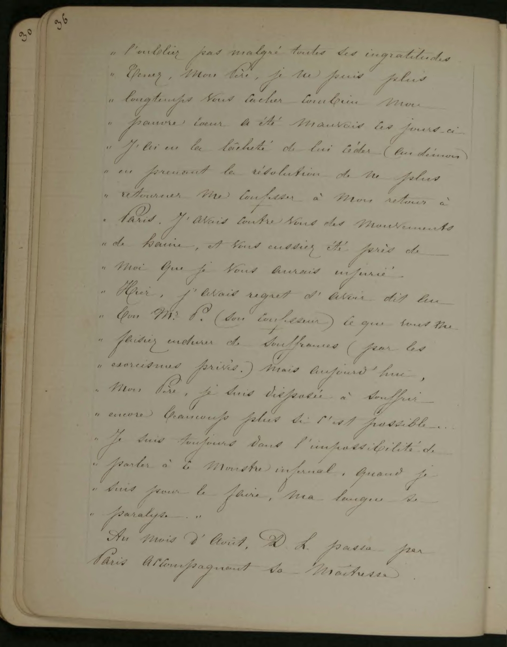 l’oubliez pas malgré toutes ses ingratitudes bercez mon Père, je ne puis plus longtemps vous cacher combien mon pauvre cœur a été mauvais ces jours-ci. J’ai eu la lâcheté de lui céder (au démon) en prenant la résolution de ne plus retourner me confesser à mon retour à Paris. J’avais contre vous des mouvements de haine, et vous eussiez été près de moi que je vous aurais injurié. Hier, j’avais regret d’avoir dit au bon Mr. P. (son confesseur) ce que vous me faisiez endurer de souffrances (par les exorcismes privés). Mais aujourd’hui, mon Père, je suis disposé à souffrir encore beaucoup plus si c’est possible. Je suis toujours dans l’impossibilité de parler à ce monstre infernal, quand je suis pour le faire, ma langue e paralyse».