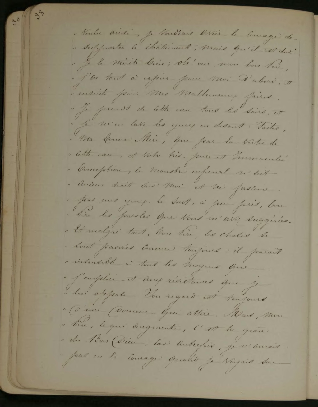 voulu ainsi, je voudrais avoir le courage de supporter ce châtiment, mais qu’il est dur! Je le mérite bien; Oh! Oui, mon bon Père, j’ai tant à expier pour moi d’abord, et ensuite pour mes malheureux frères. Je prends de cette eau tous les soirs, et je m’en lave les yeux en disant: Faites, ma bonne Mère, que par la vertu de cette eau, et votre très pure et Immaculée Conception, ce monstre infernal n’ait aucun droit sur moi et ne fascine pas mes yeux. Ce sont, à peu près, bon Père, les paroles que vous m’avez suggérées. Et malgré tout, bon Père, les choses se sont passées comme toujours, il paraît insensible à tous les moyens que j’emploie et aux résistances que je lui oppose. Son regard est toujours d’une douceur qui attire. Mais, mon Père, ce qui augmente, c’est la grâce du Bon Dieu, car autrefois, je n’aurais pas eu le courage quand je voyais son