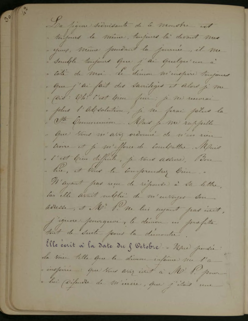 La figure séduisante de ce monstre est toujours la même, toujours là devant mes yeux, même pendant la journée, il me semble toujours que j’ai quelqu’un à côté de moi. Le démon m’inspire toujours que j’ai fait des sacrilèges et alors je me dis: Oh! C’est bien fini; je ne recevrai plus l’absolution, je ne ferai plus la St Communion. Mais je me rappelle que vous m’avez ordonné de n’en rien croire et je m’efforce de combattre. Mais c’est bien difficile, je vous assure, Bon Père, et vous le comprendrez bien». N’ayant pas reçu de réponse à sa lettre, car elle avait oublié de m’envoyer son adresse, et Mr. P. ne lui ayant pas écrit, j’ignore pourquoi le démon en profita tout de suite pour la démonter.