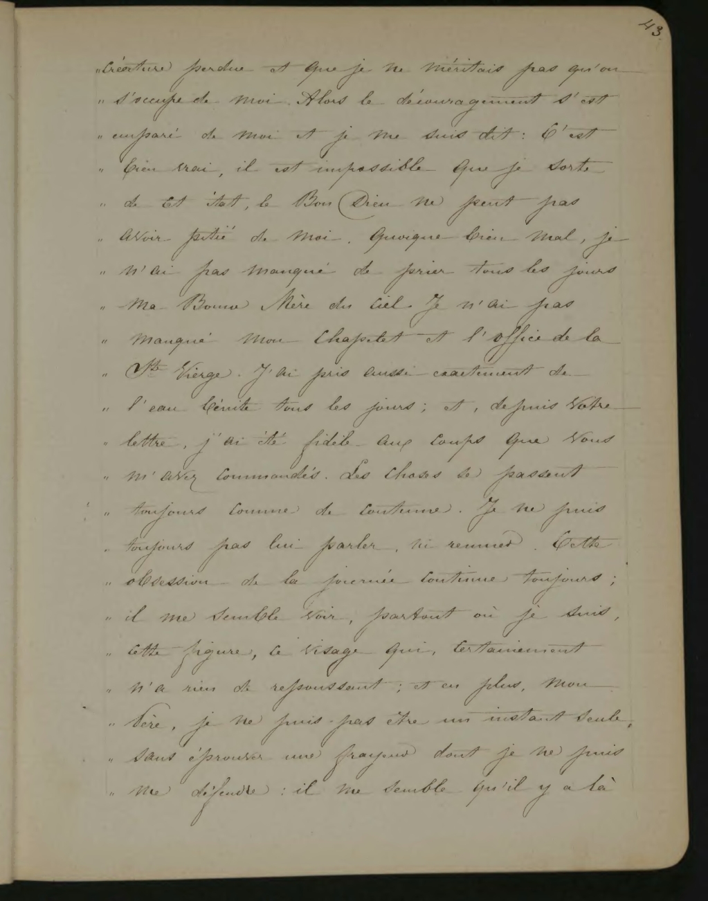 créature perdue et que je ne méritais pas qu’on s’occupe de moi. Alors le découragement s’est emparé de moi et je me suis dit: C’est bien vrai, il est impossible que je sorte de cet état, le Bon Dieu ne peut pas avoir pitié de moi. Quoique bien mal, je n’ai pas manqué de prier tous les jours ma Bonne Mère du ciel. Je n’ai pas manqué mon chapelet et l’office de la Ste Vierge. J’ai pris aussi exactement de l’eau bénite tous les jours; et, depuis votre lettre, j’ai été fidèle aux coups que vous m’avez commandés. Les choses se passent toujours comme de coutume. Je ne puis toujours pas lui parler, ni remuer. Cette obsession de la journée continue toujours; il me semble voir, partout où je suis, cette figure, ce visage qui, certainement n’a rien de repoussant; et en plus, mon Père, je ne puis pas être un instant seule, sans éprouver une frayeur dont je ne puis me défendre: il me semble qu’il y a là