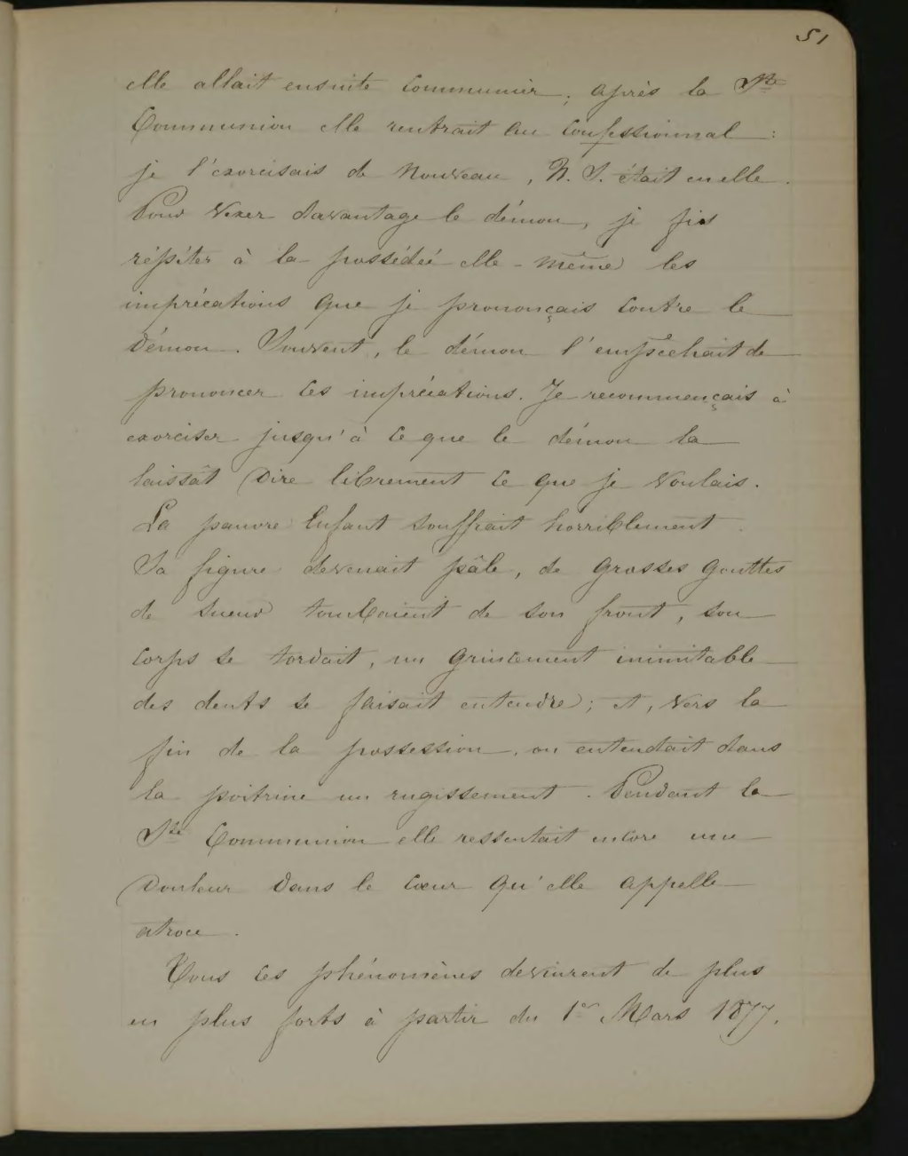elle allait ensuite communier; après la Ste Communion elle rentrait au confessionnal, je l’exorcisais de nouveau, N. S. était en elle. Pour vexer davantage le démon, je fis répéter à la possédée elle-même les imprécations que je prononçais contre le démon. Souvent, le démon l’empêchait de prononcer ces imprécations. Je recommençais à exorciser jusqu’à ce que le démon la laissait dire librement ce que je voulais. La pauvre enfant souffrait horriblement. Sa figure devenait pâle, de grosses gouttes de sueur tombaient de son front, son corps se tordait, un grincement inimitable des dents se faisait entendre; et, vers la fin de la possession, on entendait dans la poitrine un rugissement. Pendant la Ste Communion elle ressentait encore une douleur dans le cœur qu’elle appelle atroce.