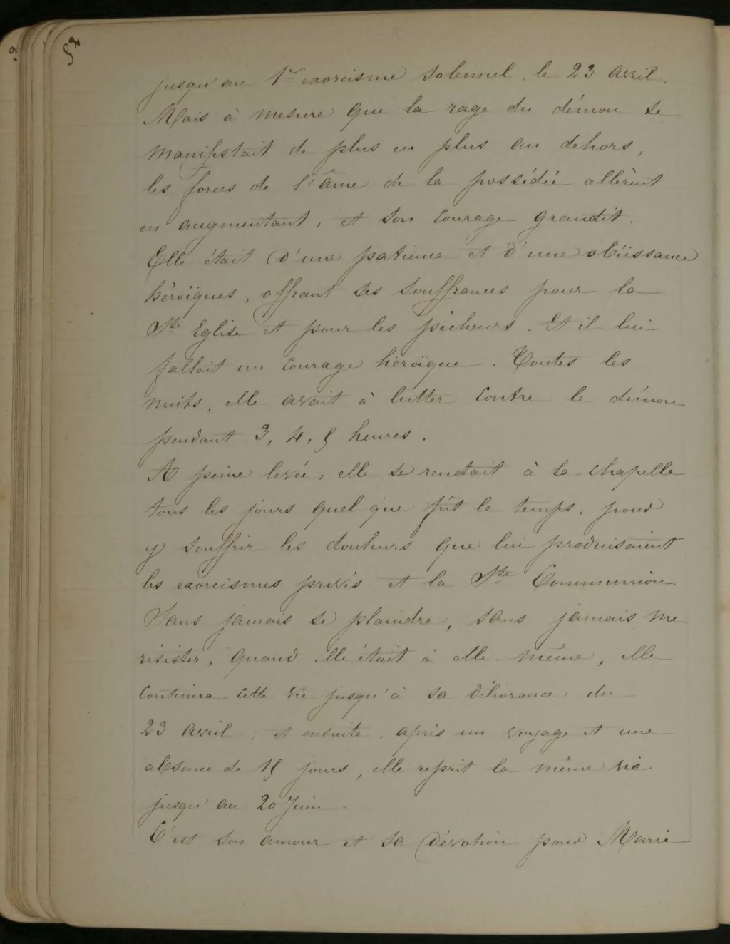 A peine levée, elle se rendait à la chapelle tous les jours quelque fût le temps, pour y souffrir les douleurs que lui produisaient les exorcismes privés et la Ste Communion. Sans jamais se plaindre, sans jamais me résister, quand elle était à elle-même, elle continua cette vie jusqu’à sa délivrance du 23 Avril; et ensuite, après un voyage et une absence de 15 jours, elle reprit la même vie jusqu’au 20 Juin.