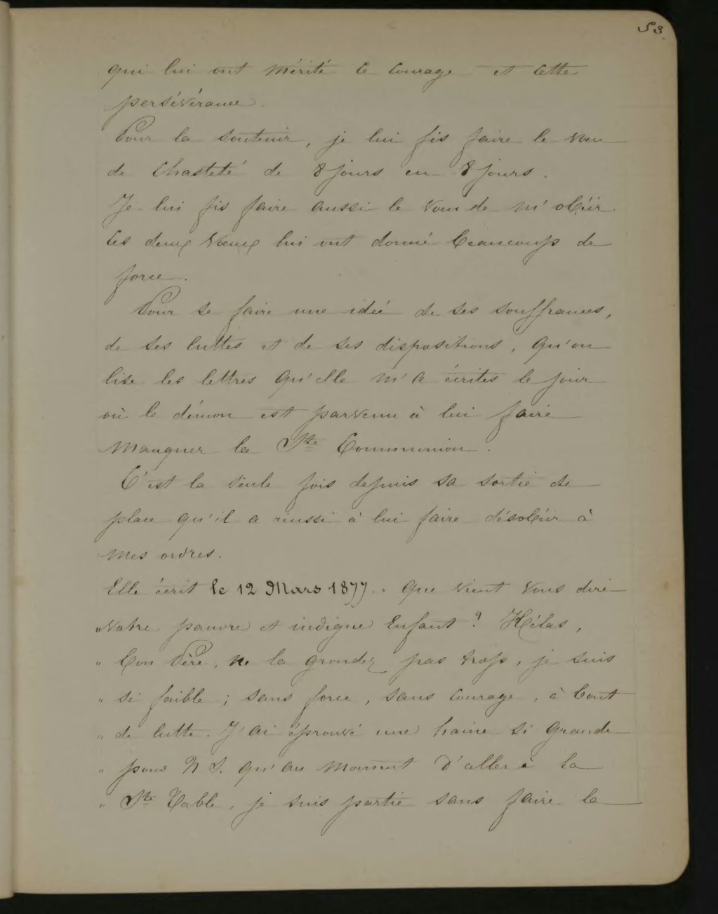 Pour se faire une idée de ses souffrances, de ses luttes et de ses dispositions, qu’on lise les lettres qu’elle m’a écrites le jour où le démon est parvenu à lui faire manquer la Ste Communion.