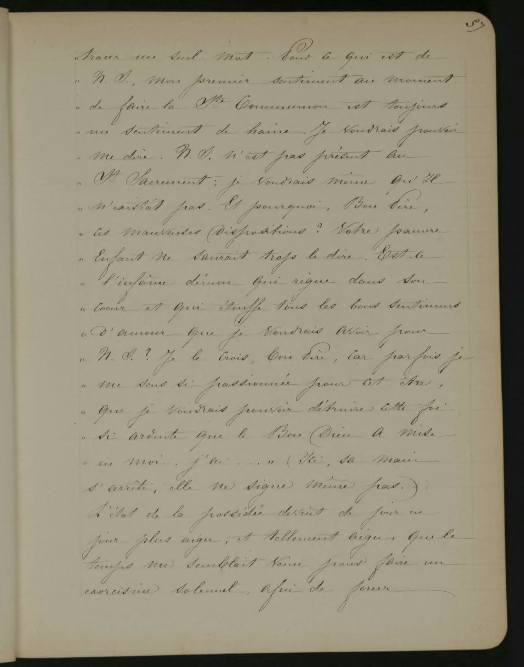 tracer un seul mot. Pour ce qui est de N. S., mon premier sentiment au moment de faire la Ste Communion est toujours un sentiment de haine. Je voudrais pouvoir me dire: N. S. n’est pas présent au St Sacrament; je voudrais même qu’Il n’existât pas. Et pourquoi, Bon Père, ces mauvaises dispositions? Votre pauvre Enfant ne saurait trop le dire. Est-ce l’infâme démon qui règne dans son cœur et qui étouffe tous les bons sentiments d’amour que je voudrais avoir pour N. S.? Je le crois, bon Père, car parfois je me sens si passionnée pour cet être, que je voudrais pouvoir détruire cette foi si ardente que le Bon Dieu a mise en moi, j’ai...» (Ici, sa main s’arrête, elle ne signe même pas.) L’état de la possédée devint de jour en jour plus aigu, et tellement aigu que le temps me semblait venu pour faire un exorcisme solennel, afin de forcer