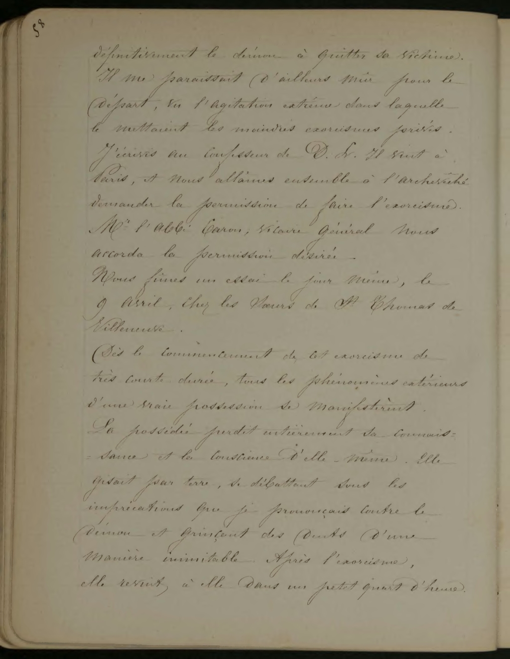 définitivement le démon à quitter sa victime. Il me paraissait d’ailleurs mûr pour le départ, vu l’agitation extrême dans laquelle le mettaient les moindres exorcismes privés. J’écrivis au confesseur de D. L. Il vint à Paris, et nous allâmes ensemble à l’archevêché demander la permission de faire l’exorcisme. Mr l’abbé Caron, vicaire général, nous accorda la permission désirée.