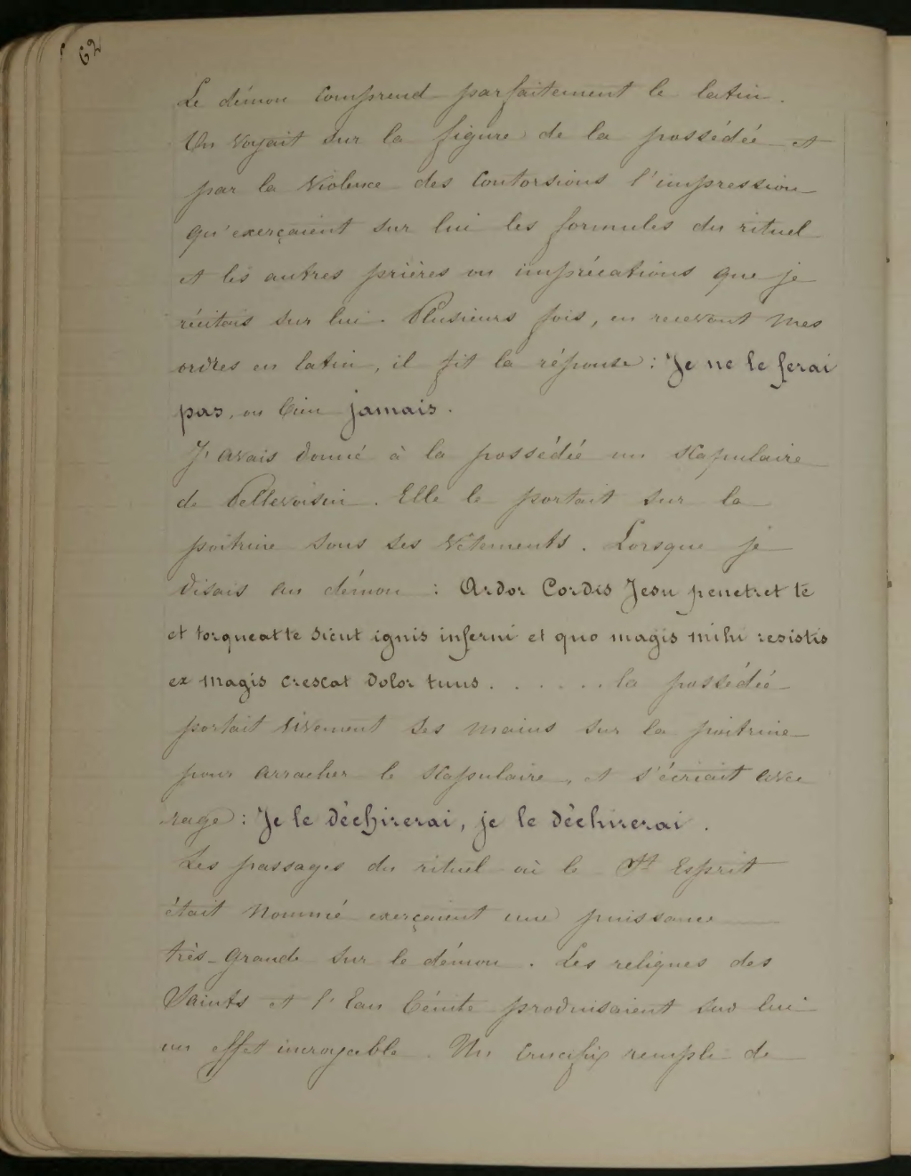 Le démon comprend parfaitement le latin. On voyait sur la figure de la possédée et par la violence des contorsions l’impression qu’exerçaient sur lui les formules du rituel et les autres prières ou imprécations que je récitais sur lui. Plusieurs fois, en recevant mes ordres en latin, il fit la réponse: Je ne le ferai pas, ou bien, jamais.