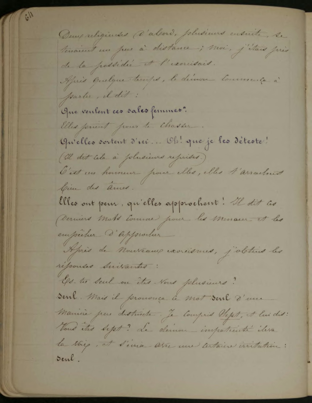 Es-tu seul ou êtes-vous plusieurs? Seul. Mais il prononça ce mot seul d’une manière peu distincte, Je compris sept, et lui dis: Vous êtes sept? Le démon impatienté éleva la voix, et s’écria avec une certaine irritation: seul.