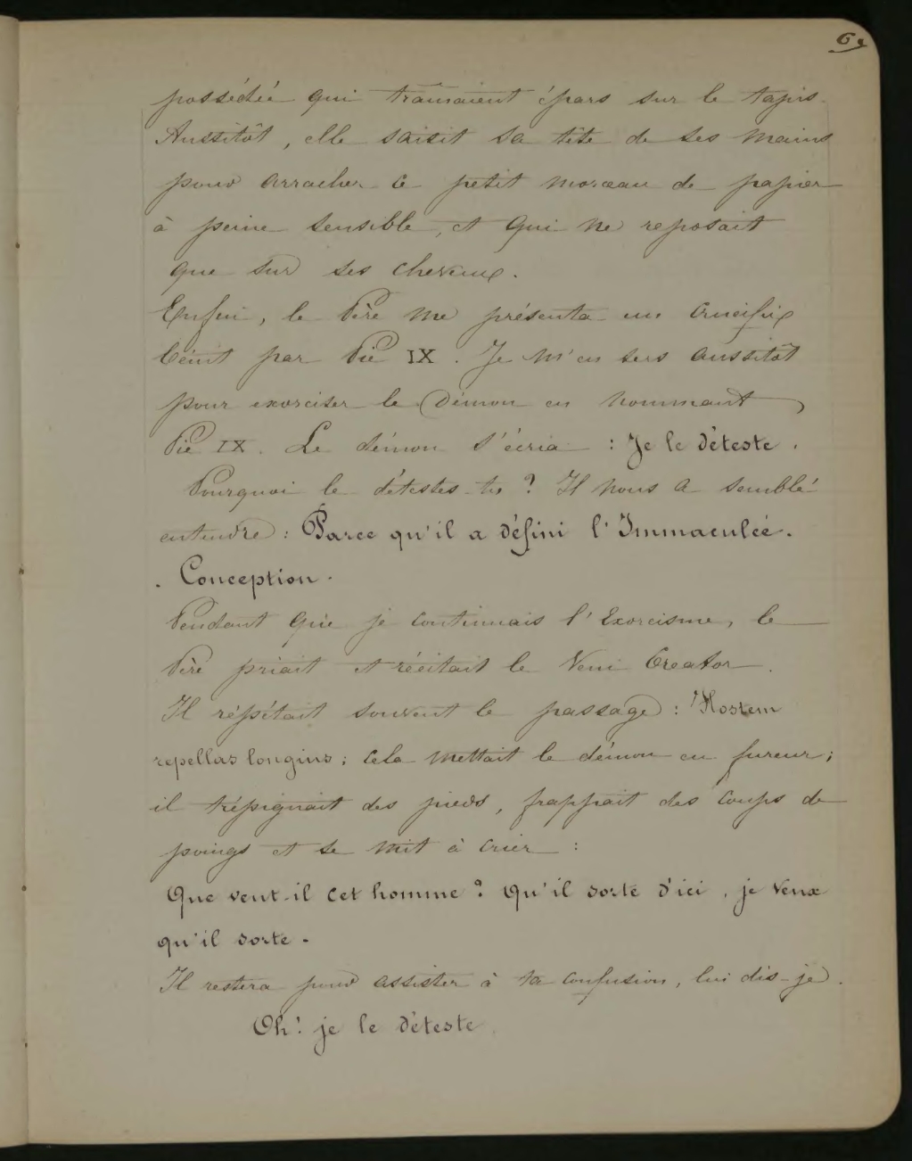 Enfin, le Père me présenta un crucifix bénit par Pie IX. Je m’en sens aussitôt pour exorciser le démon en nommait Pie IX. Le démon s’écria: Je le déteste. Pourquoi le détestes-tu? Il nous a semblé entendre: Parce qu’il a défini l’Immaculée Conception.
