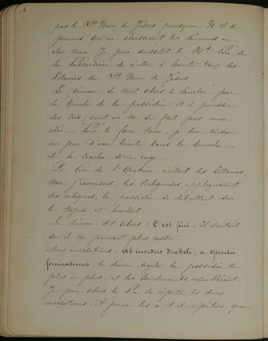 pas le St Nom de Jésus puisque N. S. a promis qu’on chasserait les démons en son nom. Je prie aussitôt le Rd Père de la Passardière de réciter à haute voix les Litanies du St Nom de Jésus.