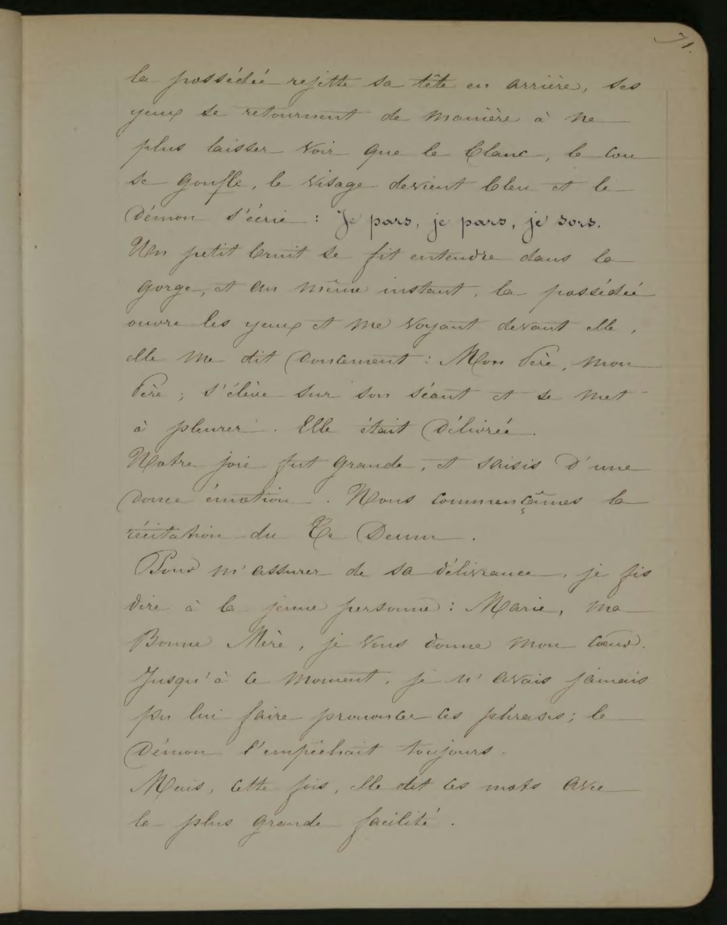 la possédée rejette sa tête en arrière, ses jeux se retournent de manière à ne plus laisser voir que le blanc, le cou se gonfle, le visage devient bleu et le démon s’écrie: Je pars, je pars, je sors. Un petit bruit se fit entendre dans la gorge, et en même instant, la possédée ouvre les yeux et me voyant devant elle, elle me dit doucement: Mon Père, mon Père, s’éluée sur son séant et se met à pleurer. Elle était délivrée.