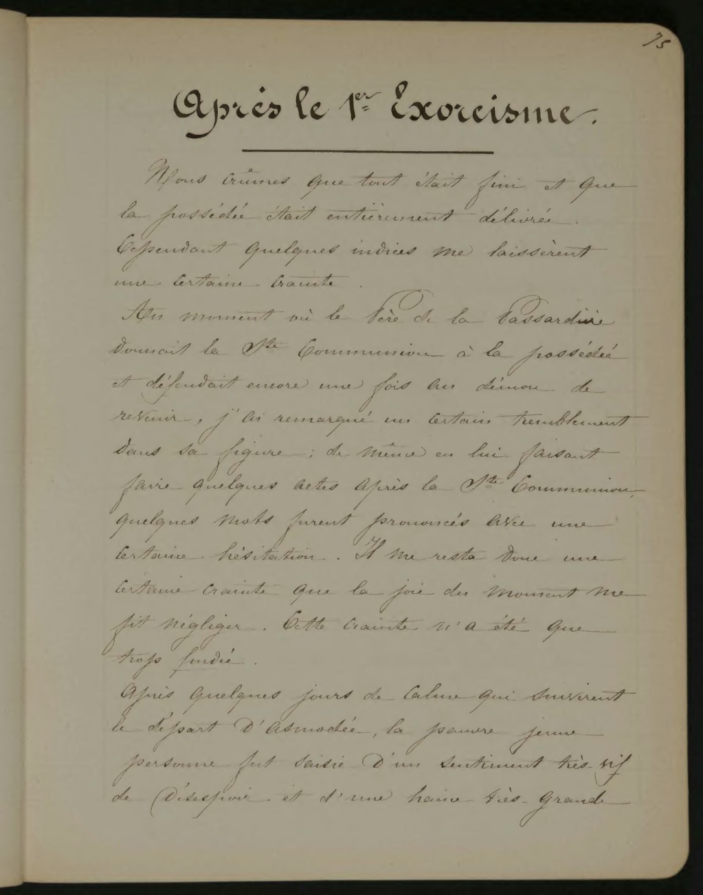 Au moment où le Père de la Passardière donnait la Ste Communion à la possédée et défendait encore une fois au démon de revenir, j’ai remarqué un certain tremblement dans sa figure; de même en lui faisant faire quelques actes après la Ste Communion quelques mots furent prononcés avec certaine hésitation. Il me resta donc une certaine crainte que la joie du moment me fit négliger. Cette crainte n’a été que trop fondée.