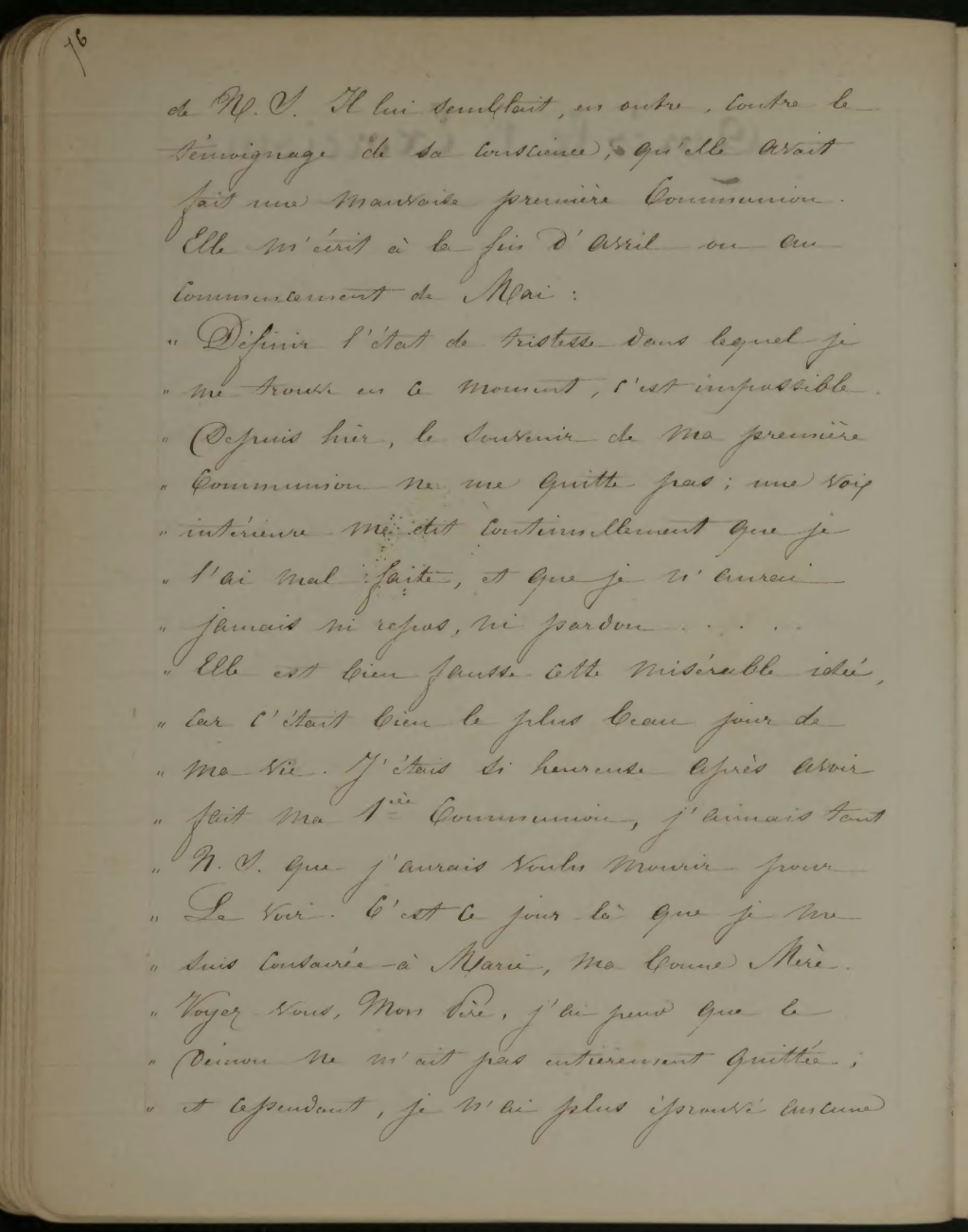 de N. S. Il lui semblait, en autre, contre le témoignage de sa conscience, qu’elle avait fait une mauvaise première Communion. Elle m’écrit à la fin d’Avril ou au commencement de Mai: