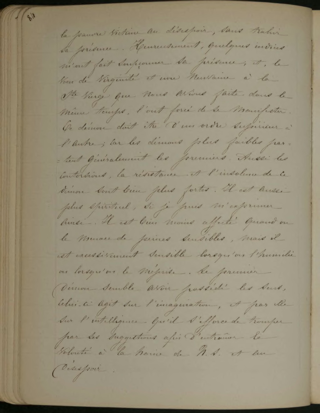 la pauvre victime au désespoir, sans trahir sa présence. Heureusement, quelques indices m’ont fait soupçonner sa présence: et, le vœu de virginité et une neuvaine à la Ste Vierge que nous avons faite dans le même temps, l’ont forcé de se manifester. Ce démon doit être d’un ordre supérieur à l’autre; car les démons plus faibles partent généralement les premières. Aussi les contorsions, la résistance et l’insolence de ce démon sont bien plus fortes. Il est aussi plus spirituel, si je puis m’exprimer ainsi. Il est bien moins affecté quand ou le menace de peines sensibles, mais il est excessivement sensible lorsqu’on l’humiliée ou lorsqu’on le méprise. Le premier démon semble avoir possédée les sens, celui-ci agit sur l’imagination, et par elle sur l’intelligence qu’il s’efforce de tromper par ses suggestions afin d’entraîneur la volonté à la haine de N. S. et au désespoir.