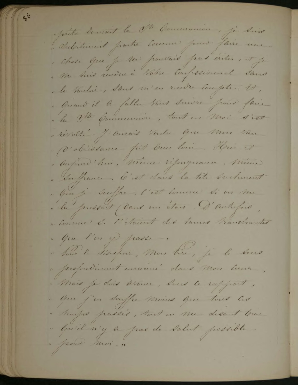 prêtre donnent la Ste Communion, je suis subitement partie comme pour faire une chose que je ne pouvais pas éviter, et je me suis rendue à votre confessionnal sans le vouloir, sans m’en rendre compte. Et, quand il a fallu vous suivre pour faire la Ste Communion, tout en moi s’est révolté. J’aurais voulu que mon vœu d’obéissance fût bien loin. Hier et aujourd’hui, même répugnance, même souffrance. C’est dans la tête seulement que je souffre, c’est comme si on me la pressait dans un étaux. D’autrefois, comme si c’étaient des lames tranchantes que l’on y passe.