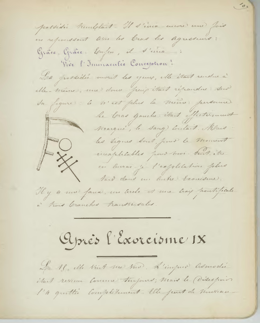 La possédée ouvrit les yeux, elle était rendue à elle-même, une douce paix était répandue sur sa figure: ce n’est plus la même personne. Le bras gauche était effectivement marqué, le sang coulait. Mais les signes sont, pour le moment, inexplicables pour moi. Peut-être en aurai-je l’explication plus tard dans un autre Exorcisme. Il y a une faux, un cercle et une croix pontificale à trois branches transversales