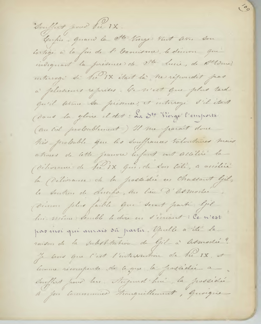 Enfin, quand la Ste Vierge vint avec son cortège à la fin de l’Exorcisme, le démon qui indiquait la présence de Ste Lucie, de Ste Edme, interrogé si Pie IX était là, ne répondit pas à plusieurs reprises. Ce n’est que plus tard qu’il avoue sa présence, et interrogé s’il était dans la gloire il dit: La Ste Vierge l’emporte (au ciel probablement). Il me paraît donc très-probable que les souffrances volontaires mais atroces de cette pauvre enfant ont accéléré la délivrance de Pie IX qui, de son côté, a accéléré la délivrance de la possédée en chassant Gil, le soutien de Lucifer, au lieu d’Asmodée, démon plus faible qui serait parti. Gil lui-même semble le dire en s’écriant: Ce n’est pas moi qui aurai dû partir. Quelle a été la raison de la substitution de Gil à Asmodée? Je crois que c’est l’intervention de Pie IX, et comme récompense de ce que la possédée a souffert pour lui. Aujourd’hui, la possédée a pu communier tranquillement, quoique