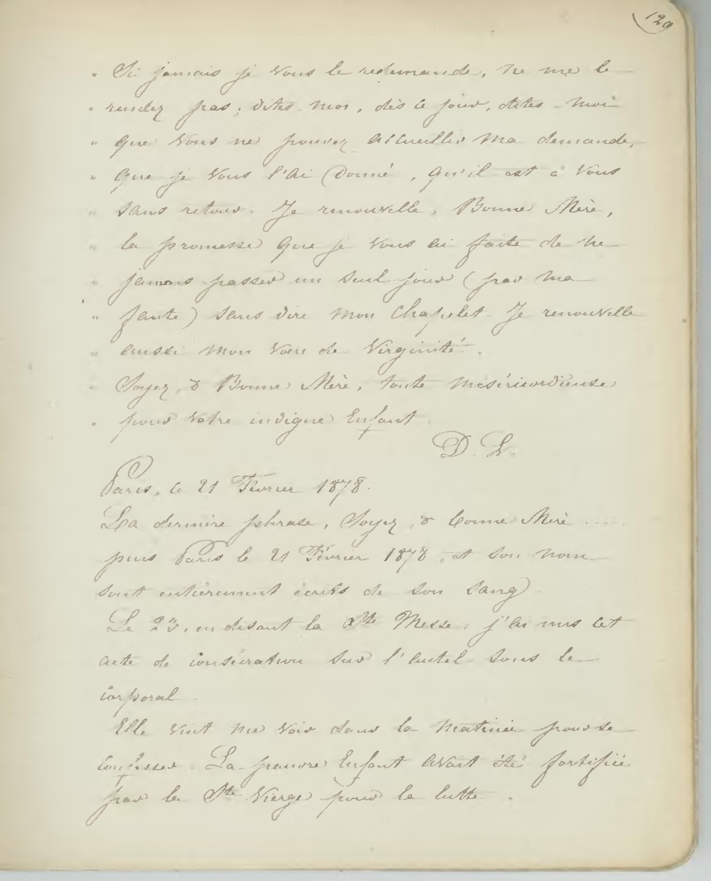 Si jamais je vous le redemande, ne me le rendez pas; dites-moi, dès ce jour, dites-moi que vous ne pouvez accueillir ma demande, que je vous l’ai donné, qu’il est à vous sans retour. Je renouvelle, Bonne Mère, la promesse que je vous ai faite de ne jamais passer un seul jour (par ma faute) sans dire mon Chapelet. Je renouvelle aussi mon vœu de virginité.