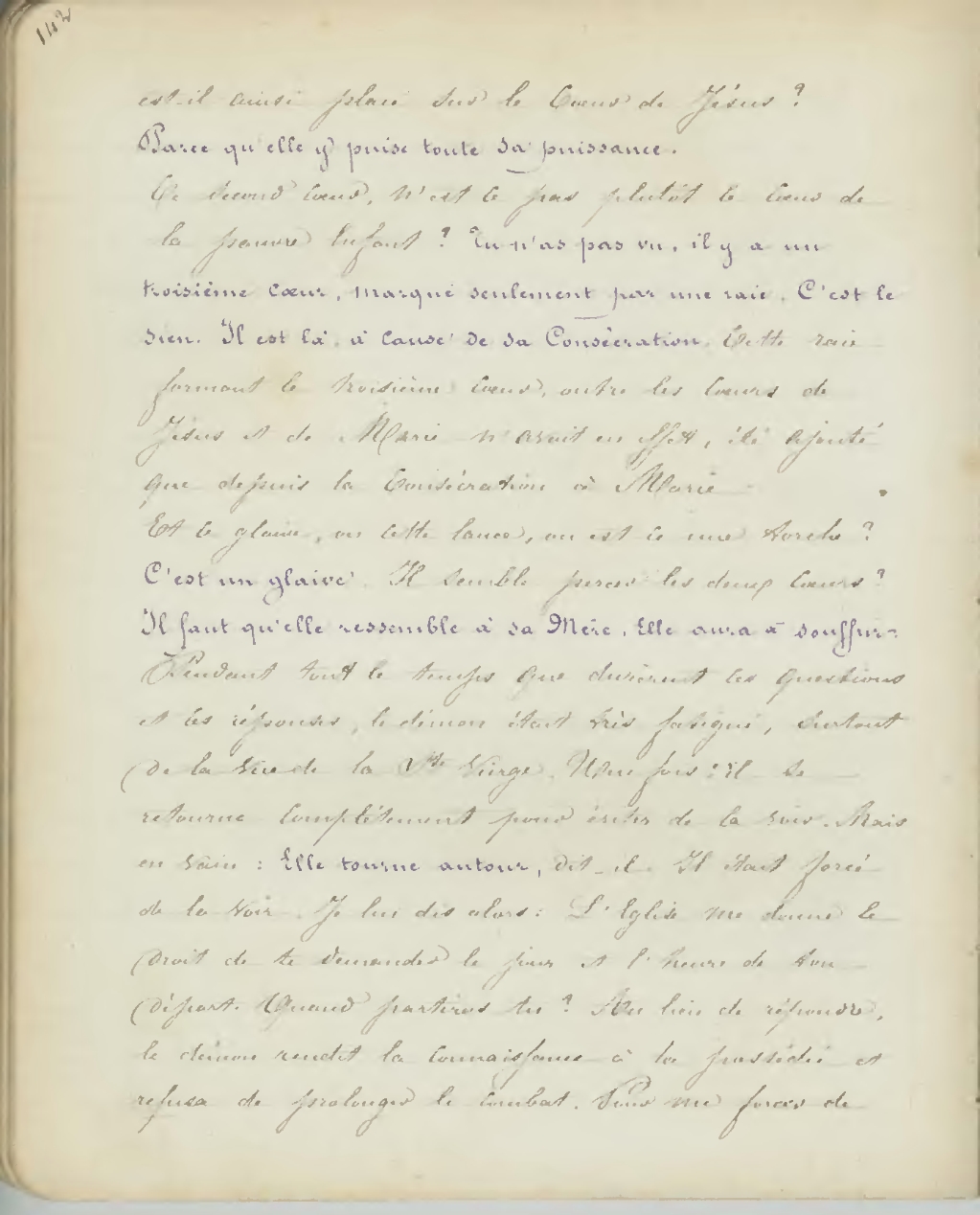 Ce second cœur, n’est-ce pas plutôt le cœur de la pauvre enfant? Tu n’as pas vu, il y a un troisième cœur, marqué seulement par une raie. C’est le sien. Il est là, à cause de sa Consécration. Cette raie formant le troisième cœur, outre les cœurs de Jésus et de Marie n’avait en effet, été ajouté que depuis la Consécration à Marie.