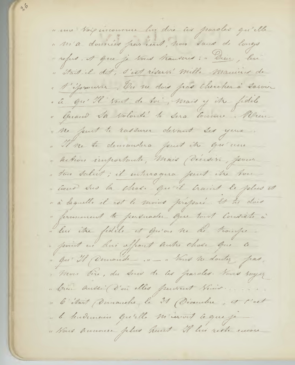 une voix inconnue lui dire ces paroles qu’elle m’a données par écrit, non sans de longs refus, et que je vous transcris: «Dieu, lui était-il dit, s’est réservé mille manières de t’éprouver. Tu ne dois pas chercher à savoir ce qu’Il veut de toi, mais être fidèle quand sa volonté te sera connue. Rien ne peut te rassurer devant ses yeux. Il ne te demandera peut-être qu’une action importante, mais décisive, pour ton salut; il interrogera peut-être ton cœur sur la chose qu’il craint le plus à laquelle il est le moins préparé. Et tu dois fermement te persuader que tout consiste à lui être fidèle et qu’on ne Le trompe pointe en lui offrant autre chose que ce qu’Il demande». - «Vous ne doutez pas, Mon Père, du sens de ces paroles. Vous soyez bien aussi d’où elles peuvent venir... C’était dimanche le 31 Décembre, et c’est le lendemain qu’elle m’écrivit ce que je vous annonce plus haut. Il lui reste encore