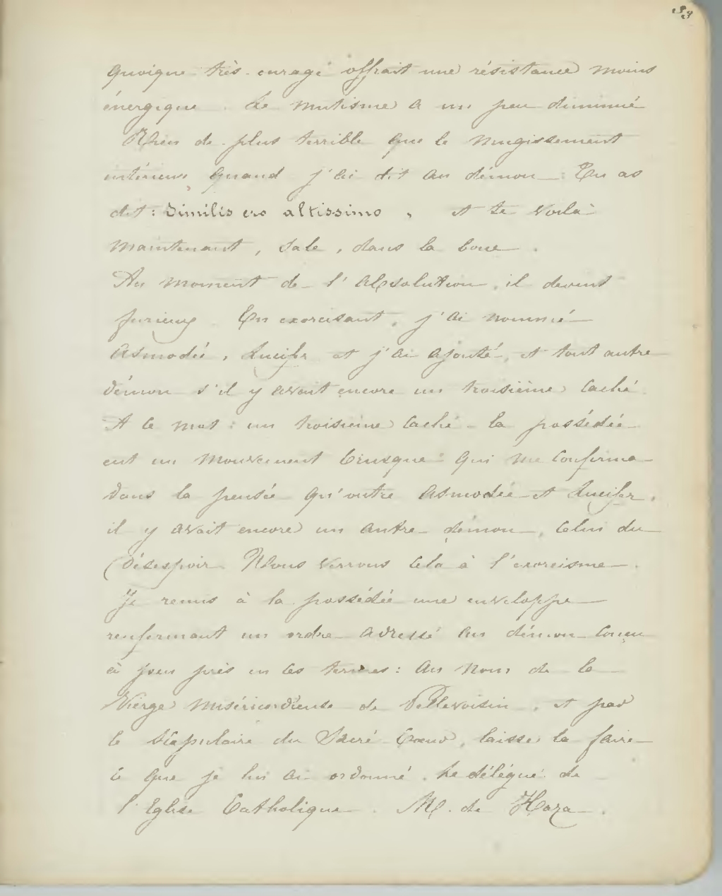 Au moment de l’absolution, il devint furieux. En exorcisant j’ai nommé Asmodée, Lucifer et j’ai ajouté, et tout autre démon s’il y avait encore troisième caché. A ce mot: un troisième caché, la possédée eut un mouvement brusque qui me confirma dans la pensée qu’outre Asmodée et Lucifer il y avait encore un autre démon, celui du désespoir. Nous verrons cela à l’exorcisme. Je remis à la possédée une enveloppe renfermant un ordre adressé au démon conçu à peu près en ces termes: au nom de la Vierge Miséricordieuse de Pellevoisin, et et par le Scapulaire du Sacré-Cœur, laisse la faire ce que je lui ai ordonné. Le délégué de l’Église Catholique. M. de Haza.