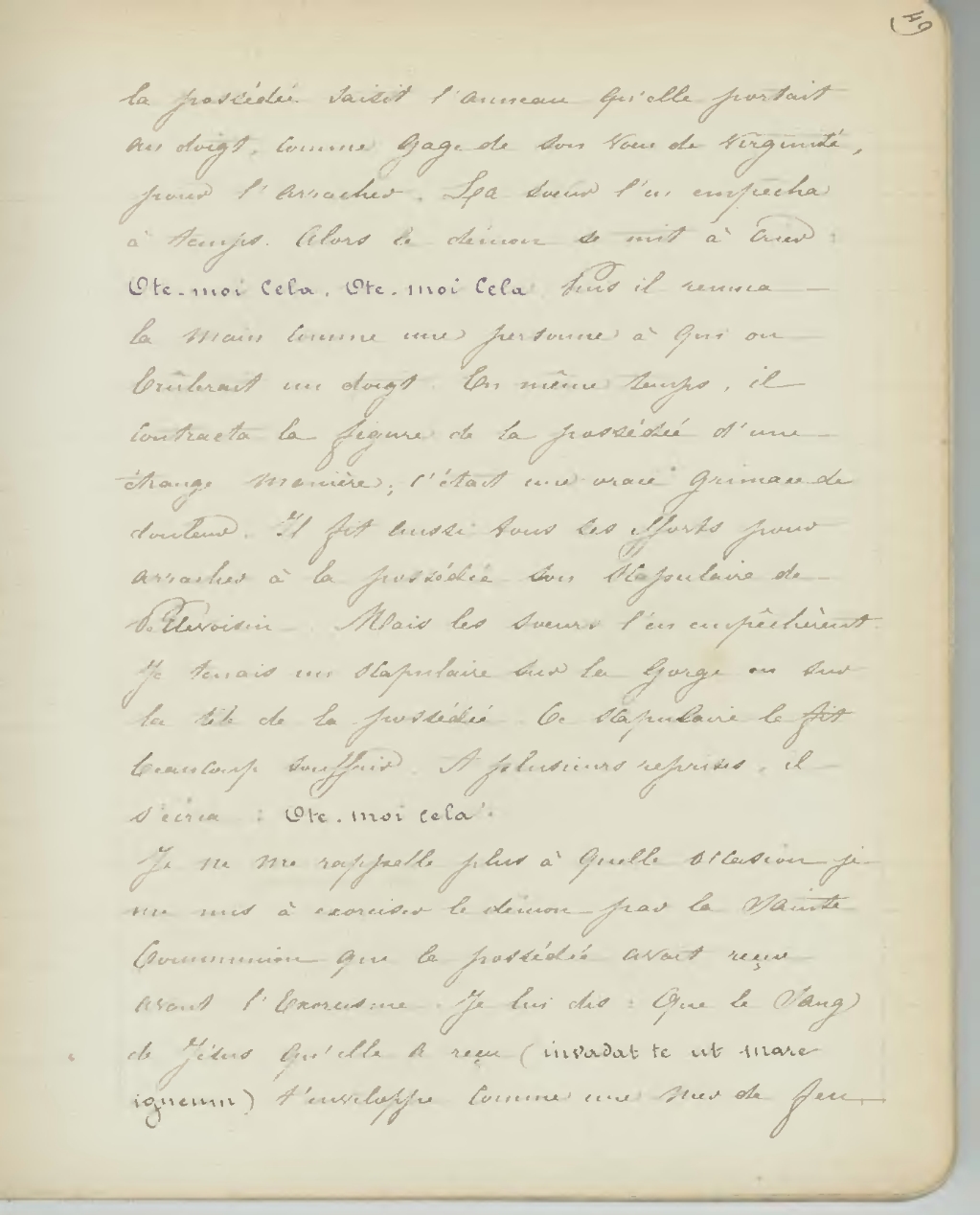 la possédée saisit l’anneau qu’elle portait au doigt, comme gage de son vœu de virginité, pour l’arracher. La sœur l’en empêcha à temps. Alors le démon se mit à crier: Ote-moi cela. Ote-moi cela. Puis il remua la main comme une personne à qui on brûlerait un doigt. En même temps, il contracta la figure de la possédée d’une étrange manière; c’était une vraie grimace de douleur. Il fit aussi tous ses efforts pour arracher à la possédée son scapulaire de Pellevoisin. Mais les sœurs l’en empêchèrent. Je tenais un scapulaire sur la gorge ou sur la tête de la possédée. Ce scapulaire le fit beaucoup souffrir. A plusieurs reprise, il s’écria: Ote-moi cela. Je ne me rappelle plus à quelle occasion je me mis à exorciser le démon par la Sainte Communion que la possédée avait reçue avant l’Exorcisme. Je lui dis: que le Sang de Jésus qu’elle a reçu (invadat te ut mare igneum) t’enveloppe comme une mer de feu