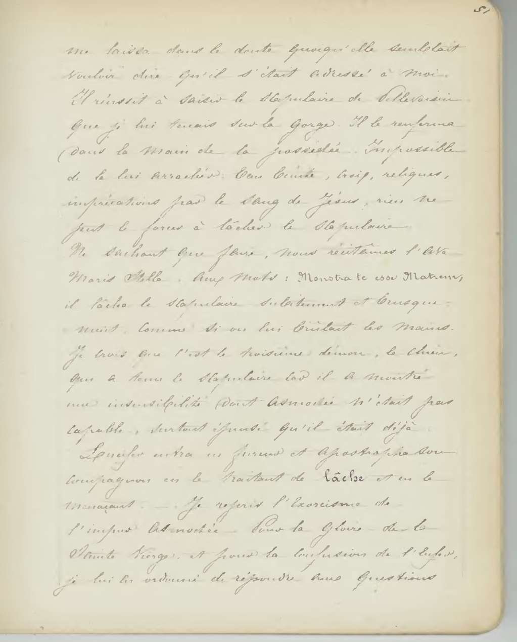 me laissa dans le doute quoiqu’elle semblait vouloir dire qu’il s’était adressé à moi. Il réussit à saisir le scapulaire de Pellevoisn que je lui tenais sur la gorge. Il le renferma dans la main de la possédée. Impossible de le lui arracher: Eau bénite, croix, reliques, imprécations par le Sang de Jésus, rien ne put le forcer à lâcher le scapulaire. Ne sachant que faire, nous récitâmes l’Ave Maris Stella. Aux mots: Monstra te esse Matrem, il lâcha le scapulaire subitement et brusquement, comme si on lui brûlait les mains. Je crois que c’est le troisième démon, le chien, qui a tenu le scapulaire car il a montré une insensibilité dont Asmodée n’était pas capable, surtout épuisé qu’il était déjà. Lucifer entra en fureur et apostropha son compagnon en le traitant de lâche et en le menaçant. Je reprise l’Exorcisme de l’impur Asmodée. Pour la gloire de la sainte Vierge, et pour la confusion de l’Enfer je lui eu ordonné de répondre aux questions
