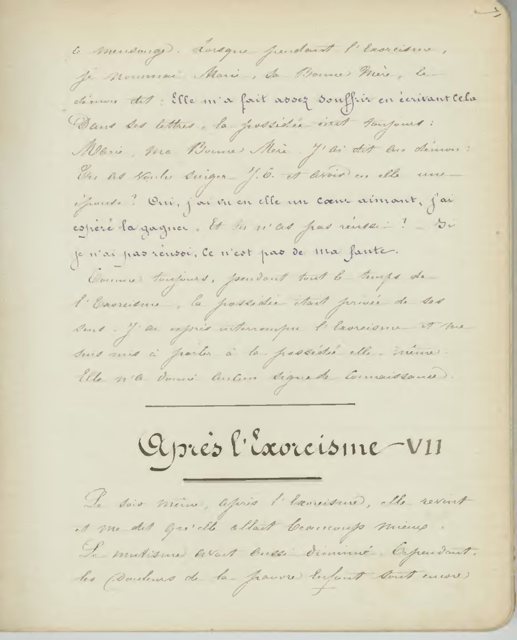 ce mensonge. Lorsque pendant l’Exorcisme, je nommai Marie, sa Bonne Mère, le démon dit: Elle m’a fait assez souffrir en écrivant cela. Dans ses lettres, la possédée écrit toujours: Marie, ma Bonne Mère. J’ai dit au démon: Tu as voulu singer J. C. et avoir en elle une épouse? Oui, j’ai vu en elle un cœur aimant, j’ai espéré la gagner. Et tu n’as pas réussi? Si je n’ai pas réussi, ce n’est pas de ma faute.