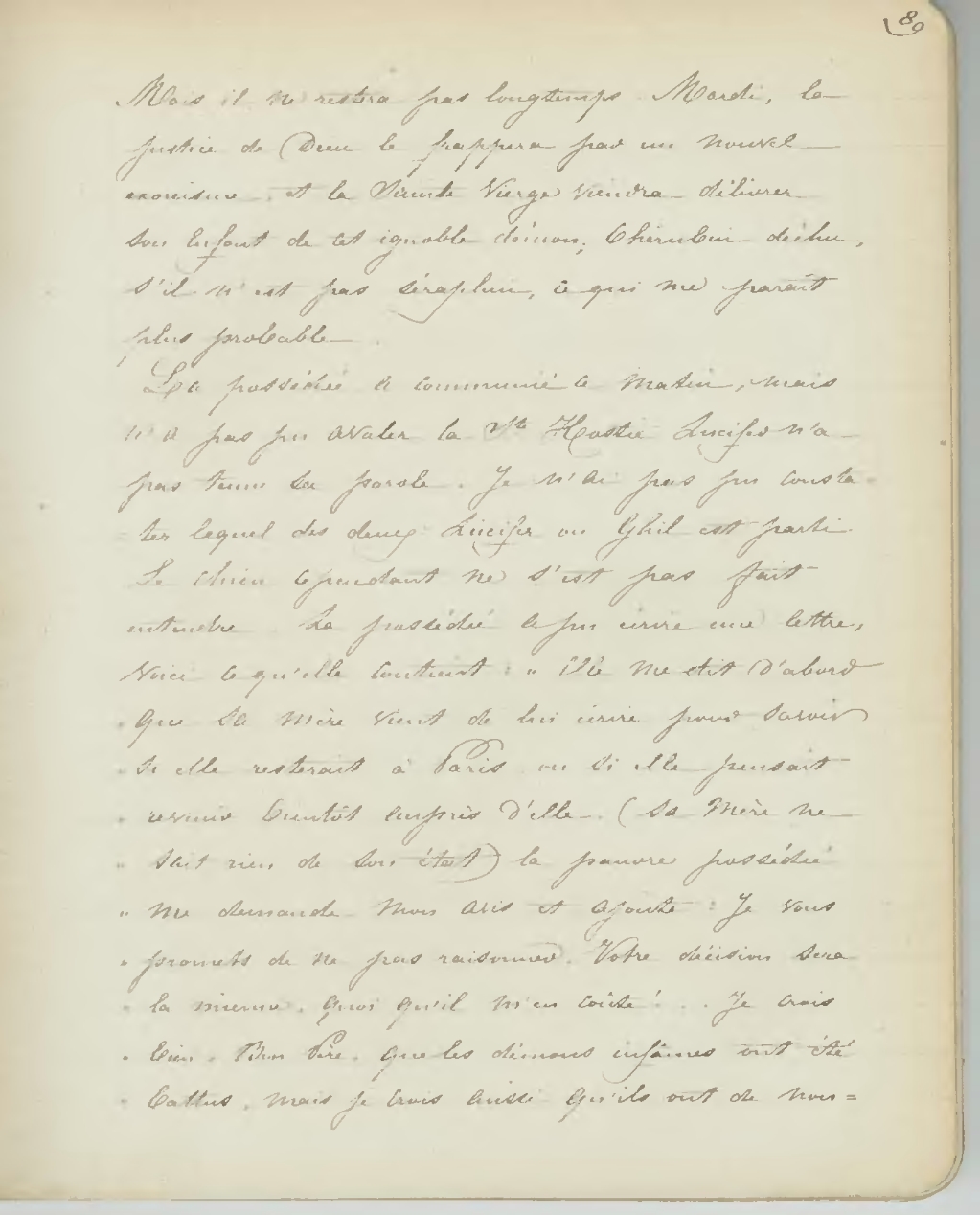 La possédée a communié ce matin, mais n’a pas pu avaler la Ste Hostie, Lucifer n’a pas tenu sa parole. Je n’ai pas pu constater lequel des deux: Lucifer ou Ghil est parti. Le chien cependant ne s’est pas fait entendre. La possédée a pu écrire une lettre, voici ce qu’elle ce qu’elle contient: «Elle me dit d’abord que sa mère vient de lui écrire pour savoir si elle resterait à Paris, ou si elle pensait revenir bientôt auprès d’elle. (Sa mère ne sait rien de son état) la pauvre possédée me demande mon avis et ajoute: Je vous promets de ne pas raisonner. Votre décision sera la mienne, quoi qu’il m’en coûte!... Je crois bien, Bon Père, que les démons infâmes ont été battus, mais je crois aussi qu’ils ont de nou-