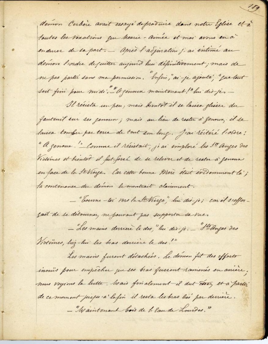 Il résista un peu, mais bientôt il se laissa glisser du fauteuil sur ses genoux; mais au lieu de rester à genoux, il se laissa tomber par terre de tout son long. J’ai réitéré l’ordre: "A genoux!" Comme il résistait, j’ai imploré les Sts Anges des Victimes et bientôt il fut forcé de se relever et de rester à genoux en face de la Ste Vierge. Car cette bonne Mère était évidemment là; la contenance du démon le montrait clairement.